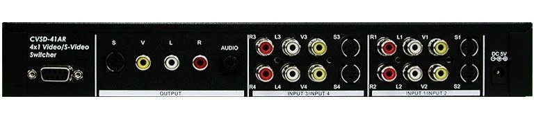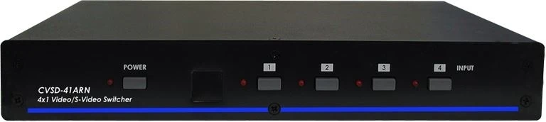Коммутатор 4х1 CV(RCA), S-Video (mini-DIN4) 576i, стереоаудио (2хRCA), доп. выход (miniJack 3,5 мм) управление по ИК и RS-232.