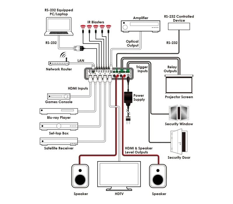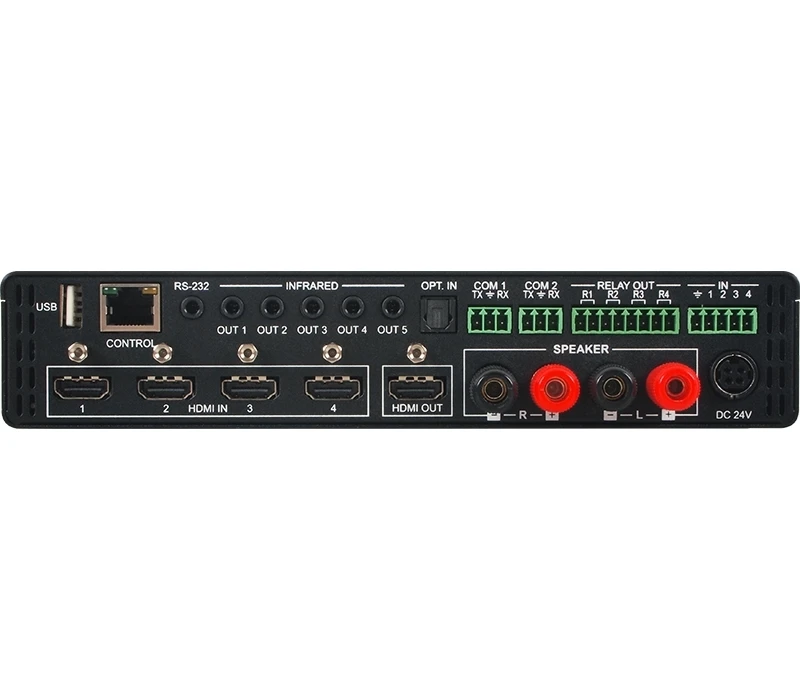 Коммутатор 4х1 HDMI 1080p/60 (3840x2160p/30, 4096x2160p/24, YUV 4:2:0 – 4096x2160p/60, 3D) с HDCP и FST, стереоусилитель мощности (4хBanana), контроллер системы управления с 4-мя триггерными входами, 2 входами/выхода RS-232, 4 релейных выхода, 5 выходов ИК, управление по IP, ИК и RS-232.