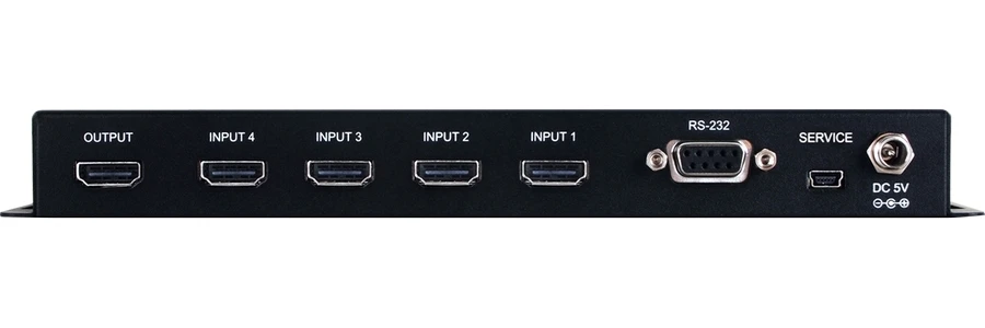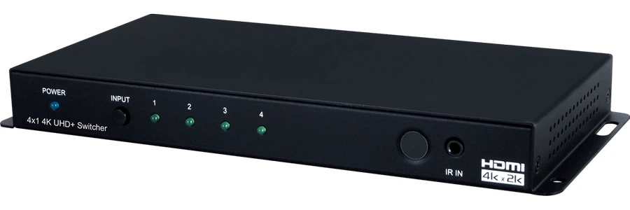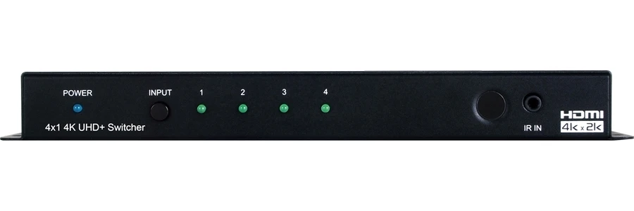 Коммутатор 4х1 HDMI 2.0 4096x2160/60, 3D (4:4:4) с HDCP 2.2, EDID (внешний/внутренний) и CEC, полоса пропускания 600 МГц, автопереключение на последний активный вход, управление по ИК и RS-232, расстояние до 10 м (5+5).