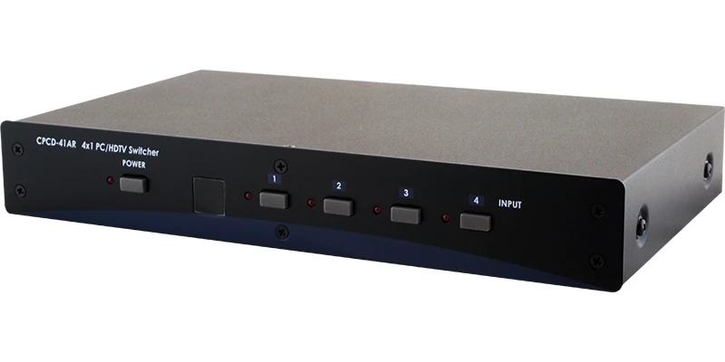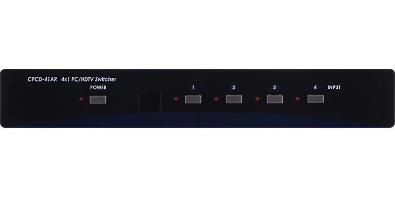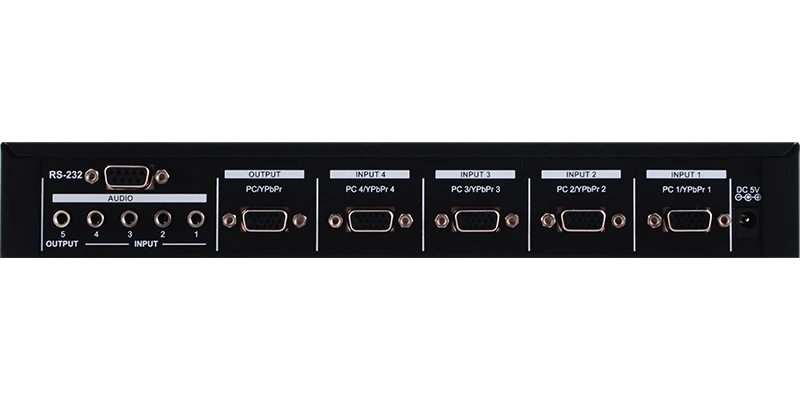 Коммутатор 4х1 VGA/YPbPr (D-sub-15) 1080p (1920х1200), стереоаудио (miniJack 3,5 мм), управление по ИК и RS-232.