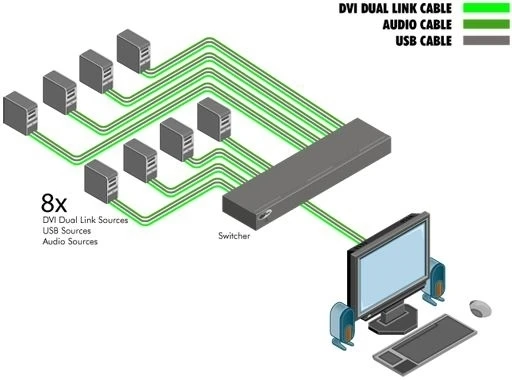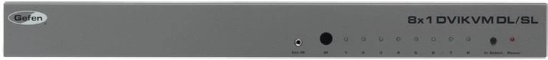 Коммутатор 8x1 сигналов DVI-D Dual Link 1080p/120 (3840х2400) с EDID, USB 2.0 и стереоаудио (miniJack 3,5 мм), управление по ИК и RS-232, корпус для установки в стойку (1U).