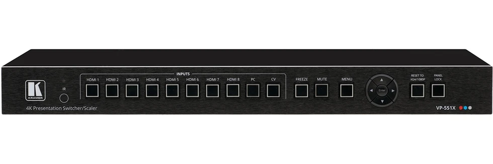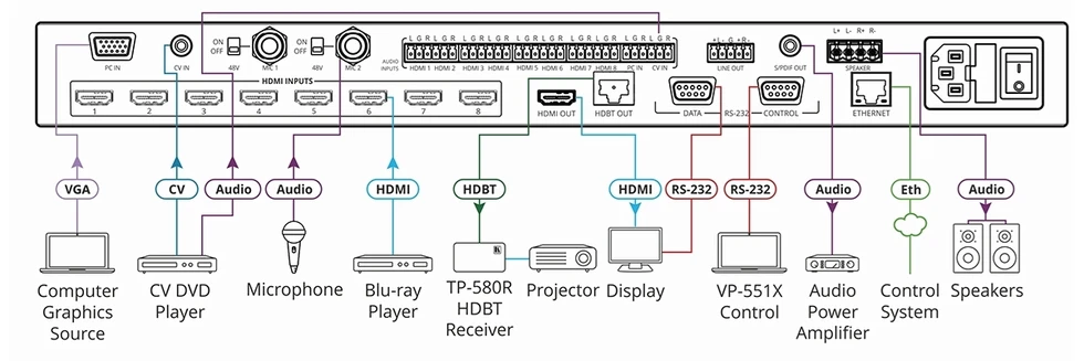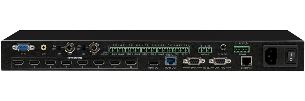 Коммутатор / масштабатор 8хHDMI с HDCP 2.2, VGA, CV в HDMI и HDBaseT с аудио, 2x Mic (Jack 6,3 мм, 48 В), до 4K/60 (4:4:4), усилитель мощности аудио 2х20 Вт/4 Ом. Управление по RS-232, ИК и IP (web-интерфейс).