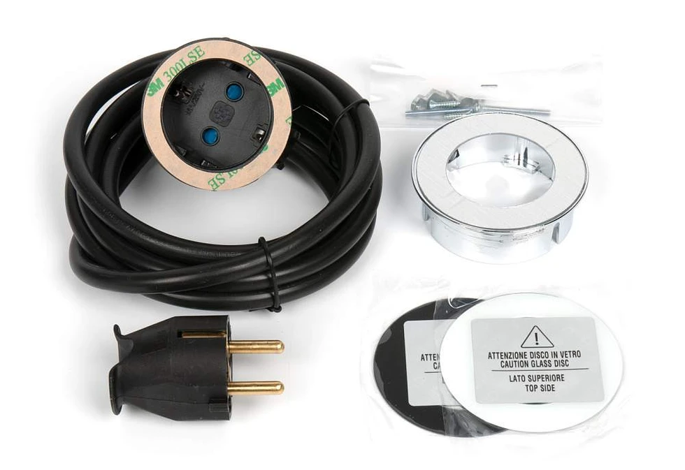 Компактная врезная евророзетка 1 эл.роз, кабель и 3 кольца (нерж.сталь, белый, черный) в комплекте