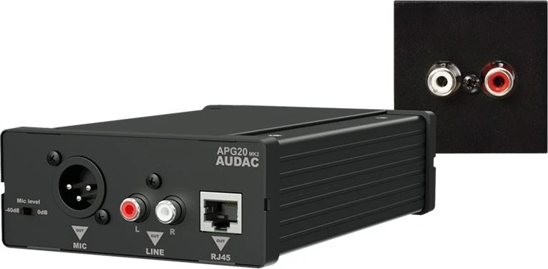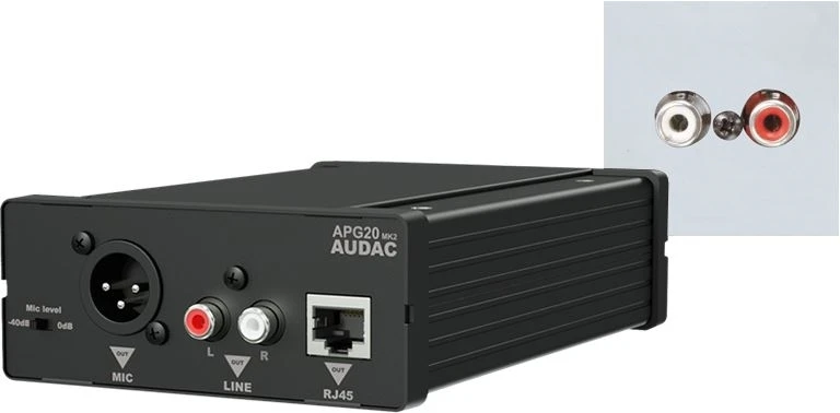 Комплект: APG20MK2 (приемник 2хRCA + XLR) + WLI18/W (передатчик 2хRCA) + CF45S/W (рамка на 1 модуль), передатчик и рамка белого цвета.