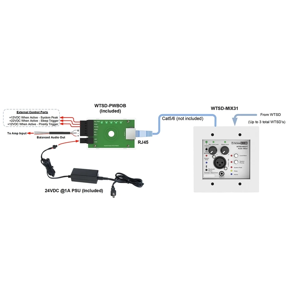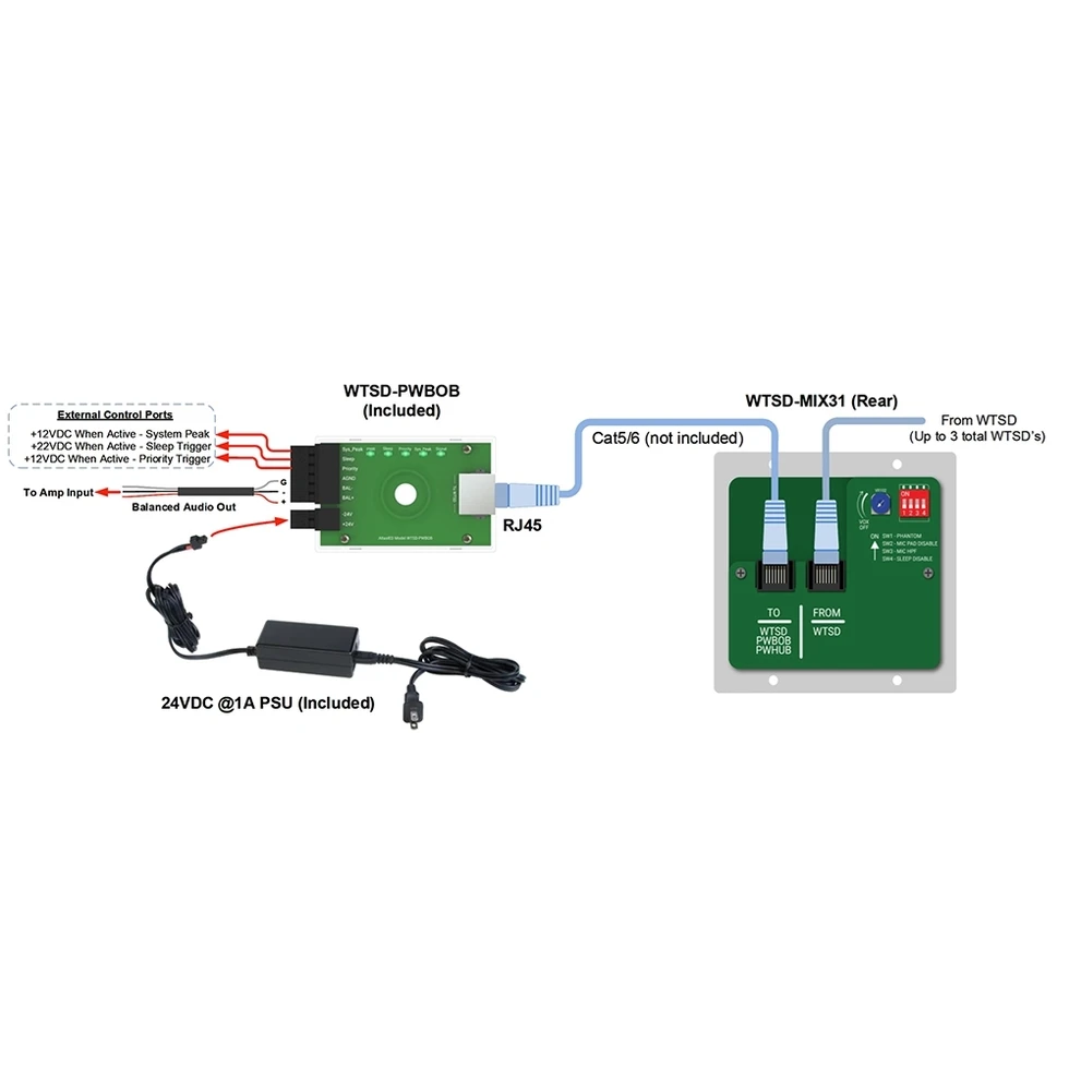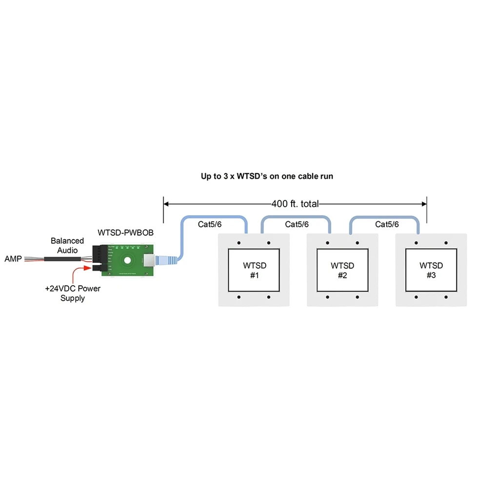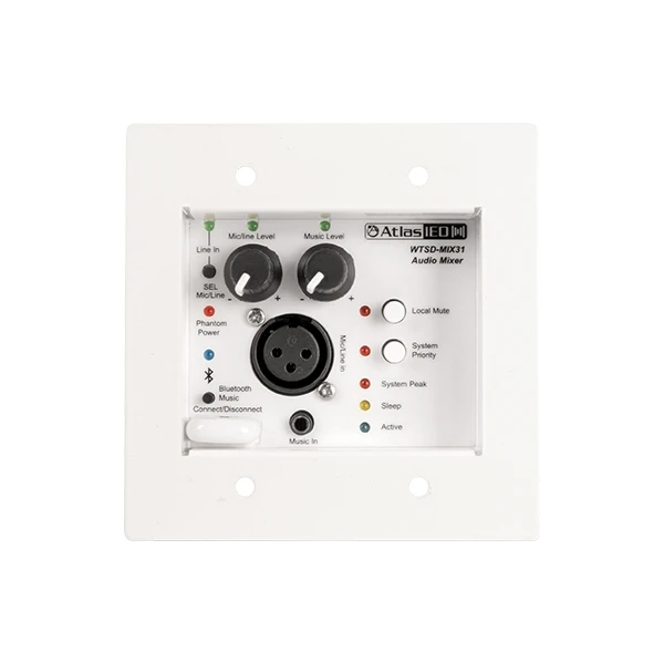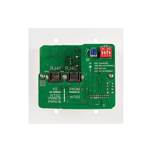 Комплект из настенной панели-микшера 3x1 (микр., AUX, Bluetooth, линейный стереовход) с выбором приоритета и приемного блока WTSD-PWBOB, соединенных витой парой. Дальность передачи по Cat.5/6 до 120 м.