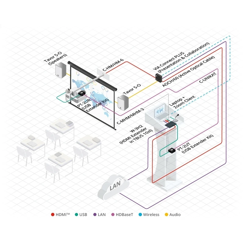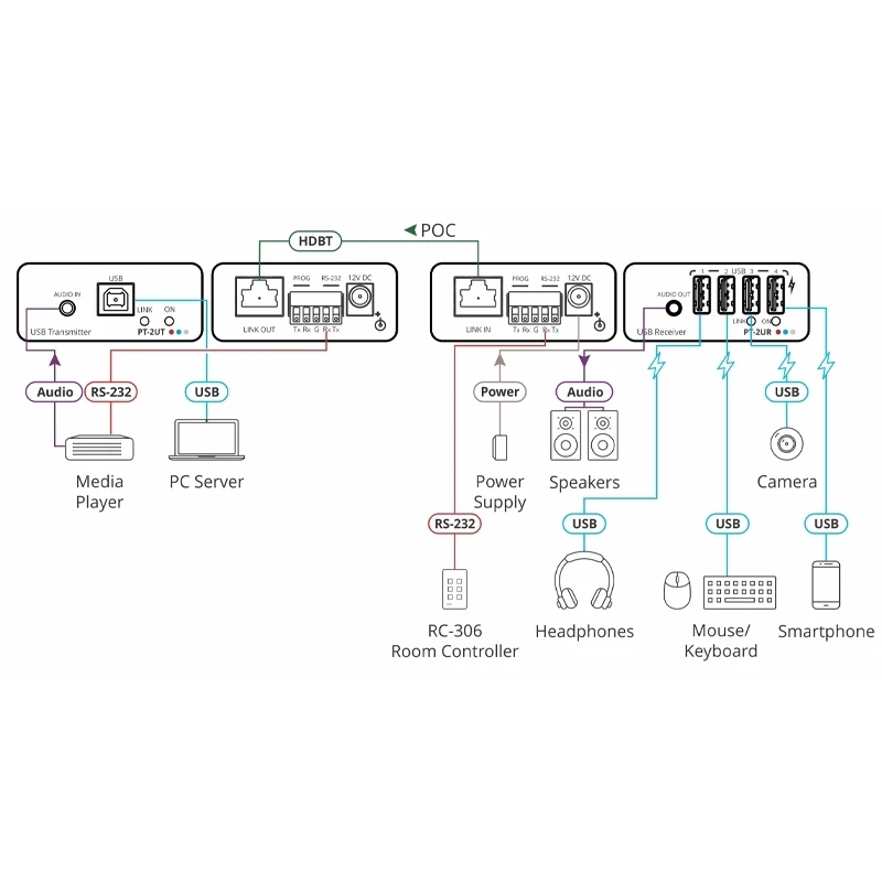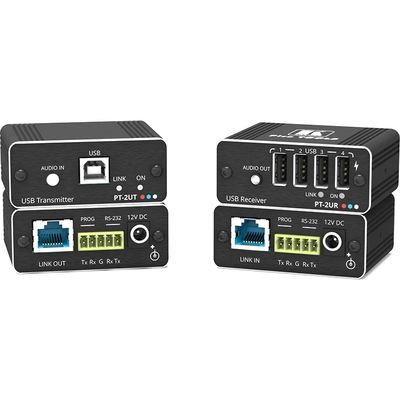 Комплект из передатчика и приемника аудио, USB 2.0 и RS-232 по витой паре HDBaseT с двунаправленным питанием. 4-портовый хаб USB на приемнике.