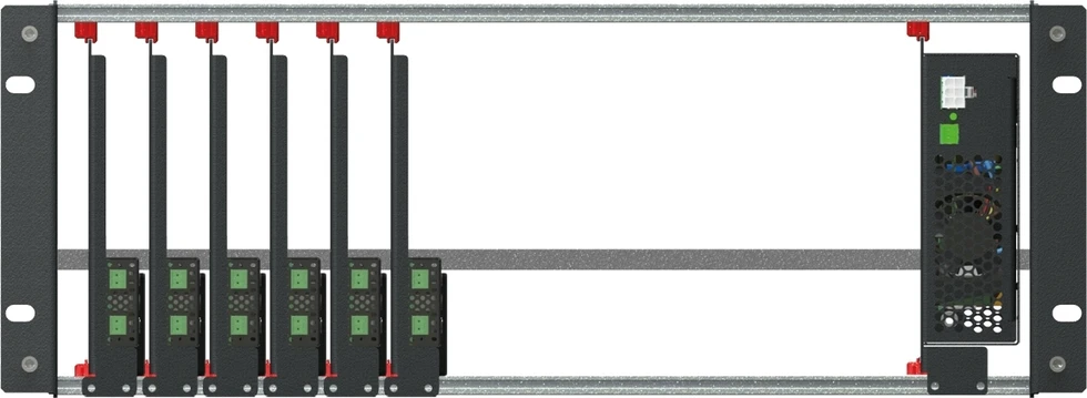 Комплект ONErack для группового монтажа в рэковую стойку, состоящий из шасси 5U, шести модулей и блока питания 250 Вт.