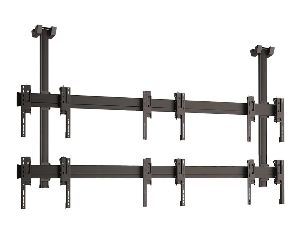 Комплект потолочного крепления для видеостены 2х3 Vogels C2315. арт 8853 из дисплеев с диагональю экрана 42-50''. Альбомная ориентация. Стандарт VESA от 100x100 до 400x400 мм. Наклон +7°/-3°. Возможна регулировка в трех плоскостях. Длина штанги - 150 см. Предусмотрен скрытый кабель канал CIS. Допустимая нагрузка - 160 кг. Мах масса одного дисплея - 26 кг. Цвет черный.