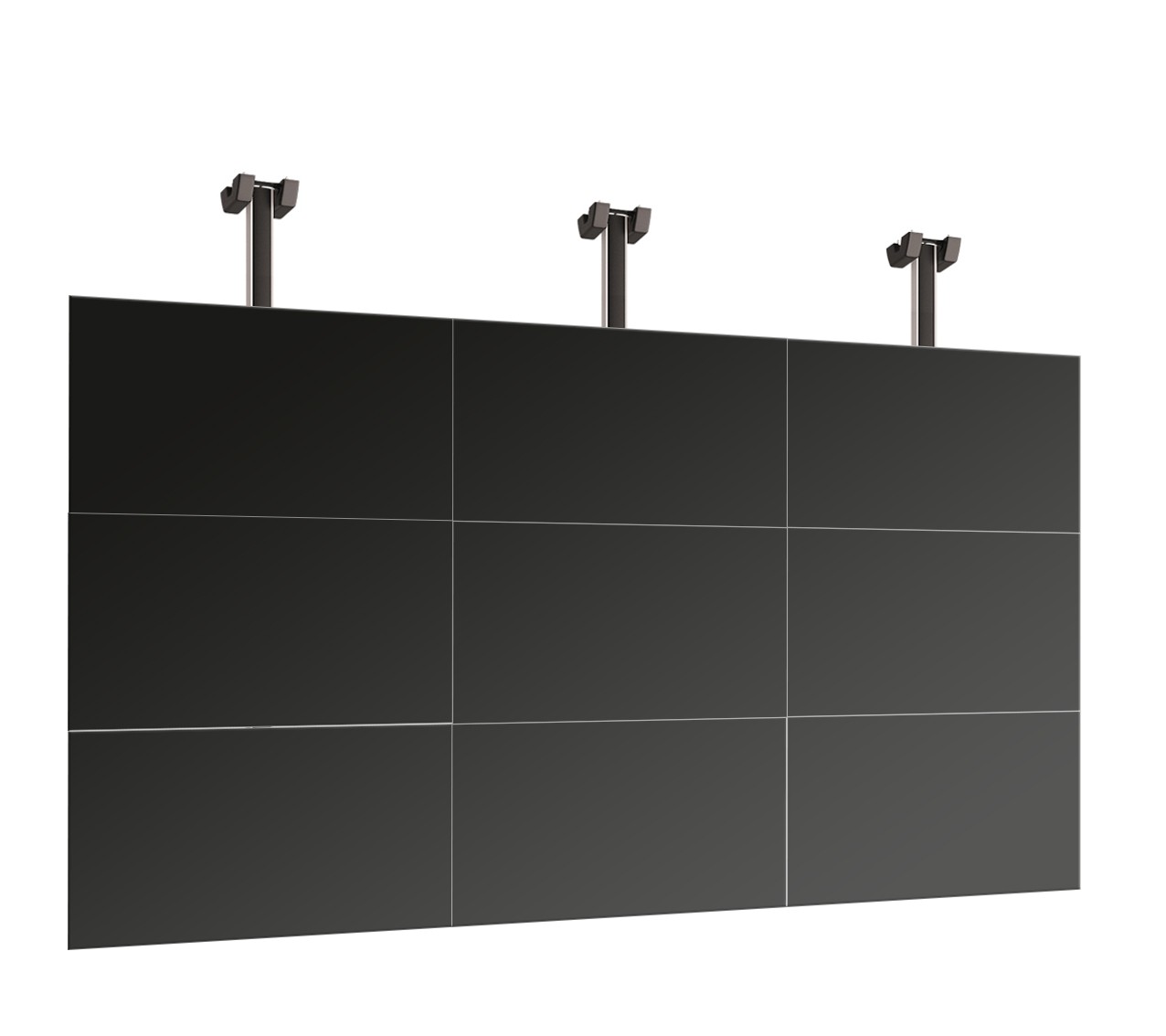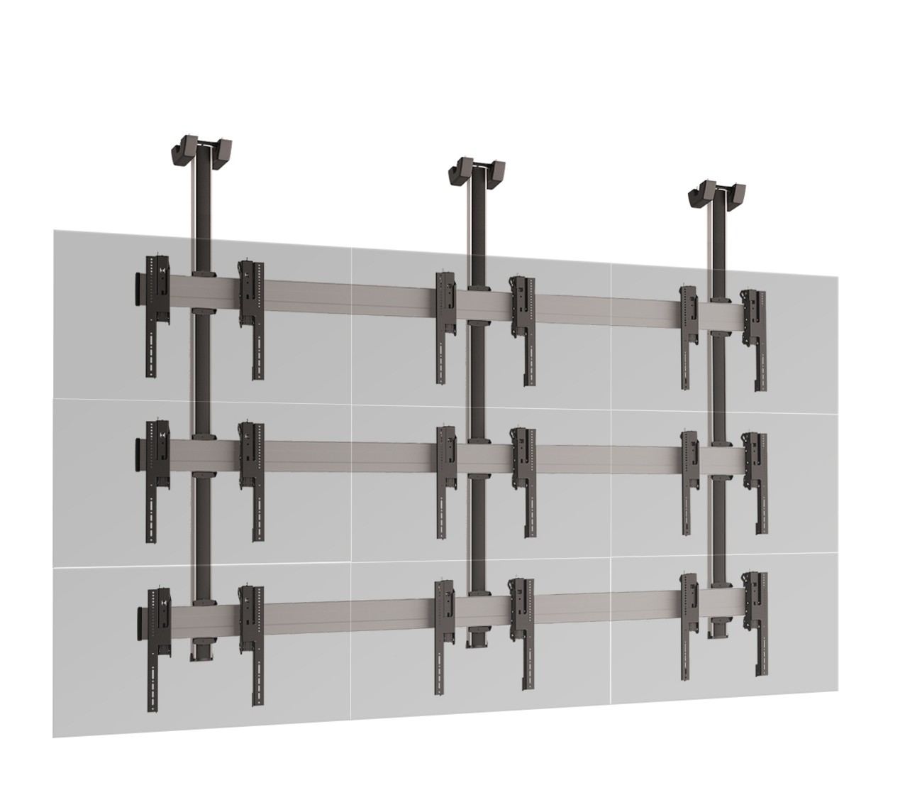 Комплект потолочного крепления для видеостены 3х3 Vogels C3330S. арт 8857 из дисплеев с диагональю экрана 42-50''. Альбомная ориентация. Стандарт VESA от 100x100 до 400x400 мм. Наклон +7°/-3°. Возможна регулировка в трех плоскостях. Длина штанги - 300 см. Предусмотрен скрытый кабель канал CIS. Допустимая нагрузка - 240 кг. Мах масса одного дисплея - 26 кг. Цвет серебристый.