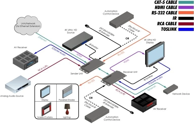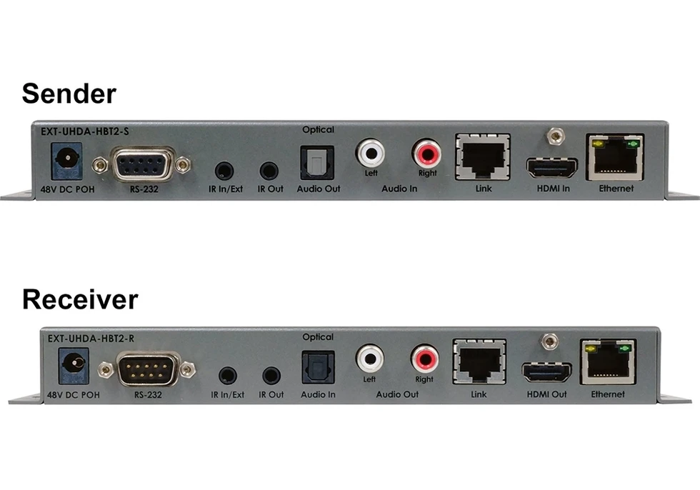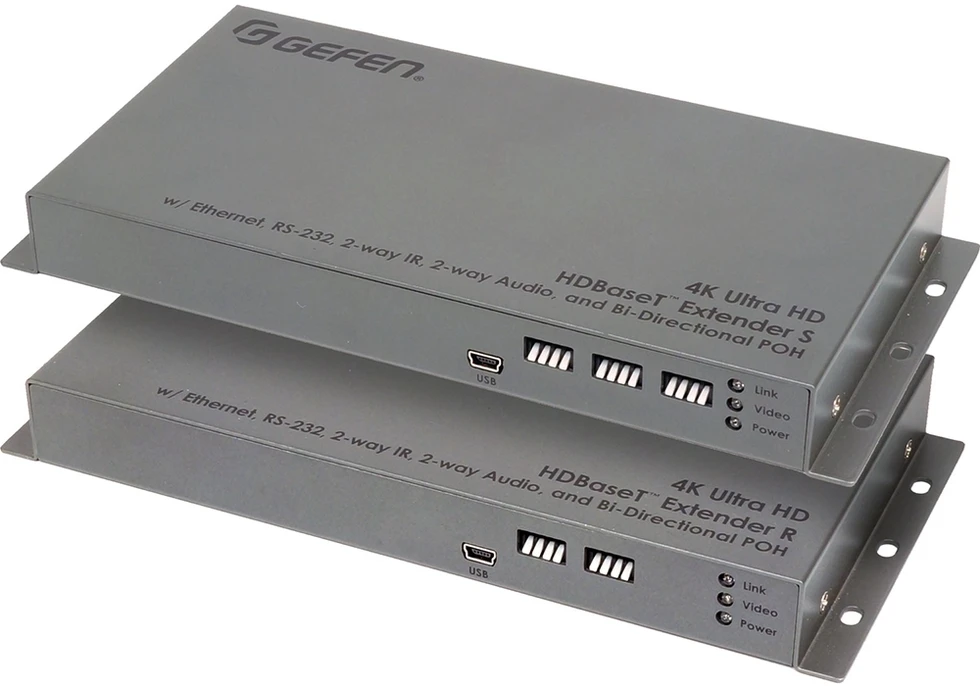 Комплект устройств для передачи HDMI 2.0 (4096x2160/30 при YUV 4:4:4, 3840x2160/60 при YUV 4:2:0, 3D) с HDCP 2.2/1.4, EDID, RS-232 (D-sub-9), Ethernet, аналогового стерео (2хRCA), обратного цифрового S/PDIF (TOSLINK) и двунаправленного ИК (2х miniJack 3,5 мм) по витой паре CAT5e с двунаправленным POH, HDBaseT 2.0, расстояние передачи 4K до 100 м, 1080p – до 150 м, поддержка Syner-G.