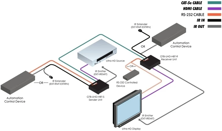 Комплект устройств для передачи HDMI 2.0 (4096x2160/30 при YUV 4:4:4, 3840x2160/60 при YUV 4:2:0, 3D) с HDCP 2.2/1.4, EDID, CEC, RS-232 (Phoenix) и двунаправленного ИК (2х miniJack 3,5 мм) по витой паре CAT5e с двунаправленным POL, HDBaseT, расстояние передачи 4K – до 100 м, 1080p – до 150 м, поддержка Syner-G, цвет черный.