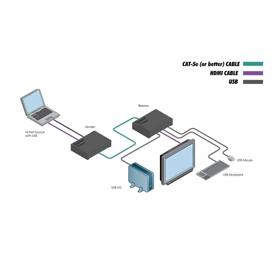 Комплект устройств для передачи сигналов DVI-D Single Link 1080p (1920x1200) с HDCP и EDID, USB 2.0 по витой паре CAT5e, расстояние –100 м.
