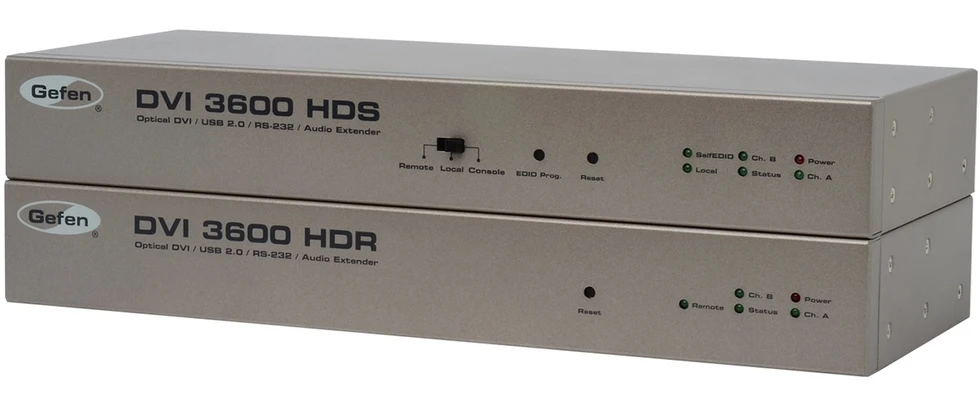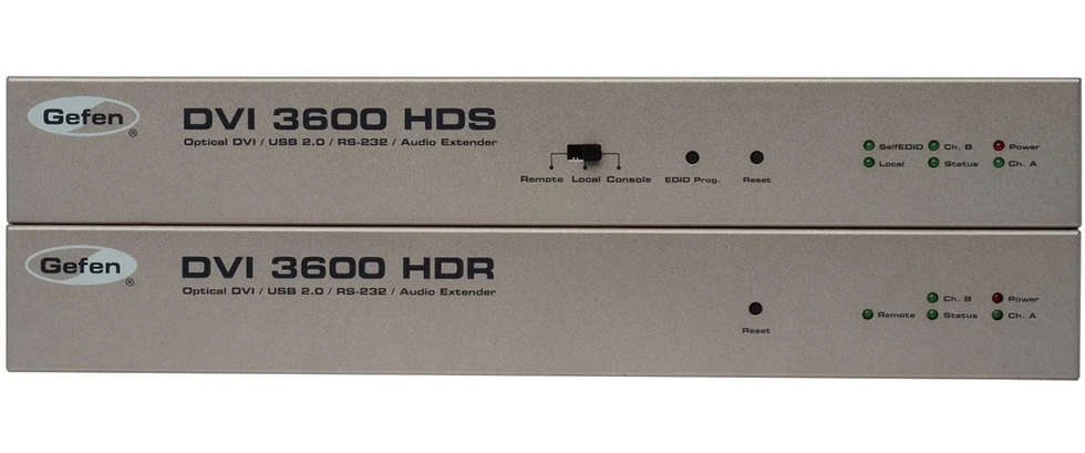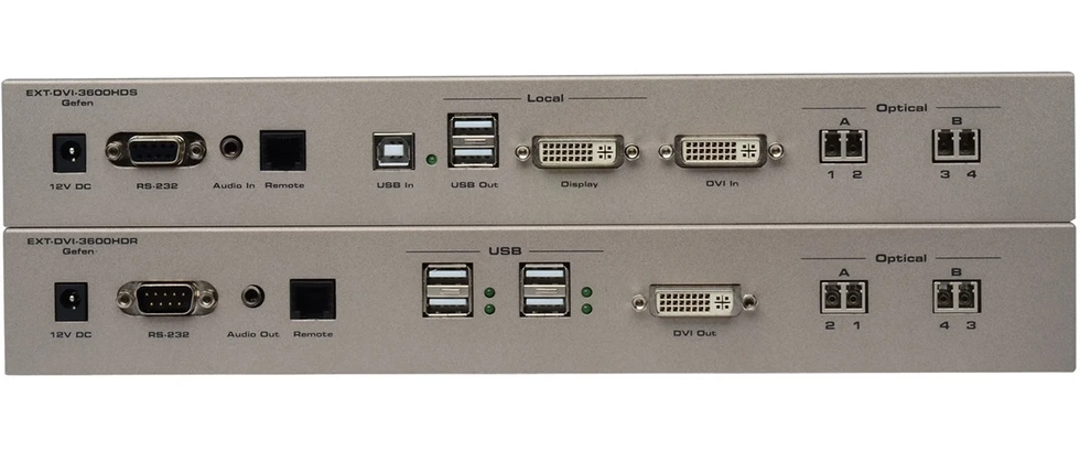 Комплект устройств для передачи сигналов DVI-D Single Link 1920x1200/60 с EDID, USB 2.0, стереоаудио (miniJack 3,5 мм) и RS-232 (D-sub-9) по оптоволоконному кабелю (4xLC), расстояние: 2000 м по одномодовому кабелю, 500 м – по многомодовому.
