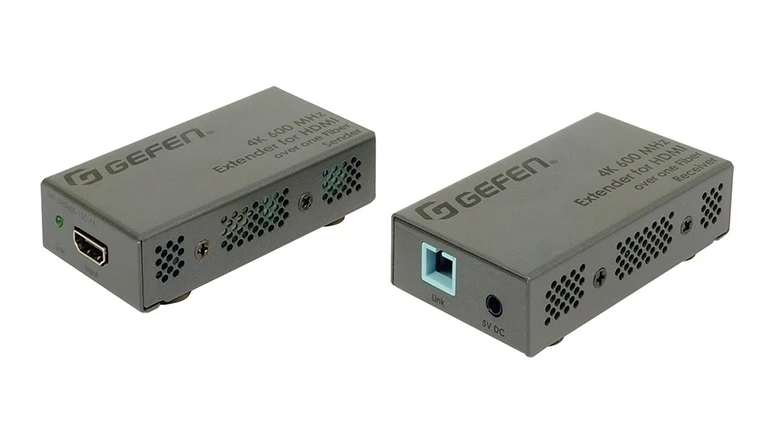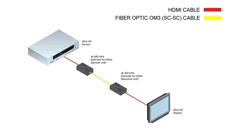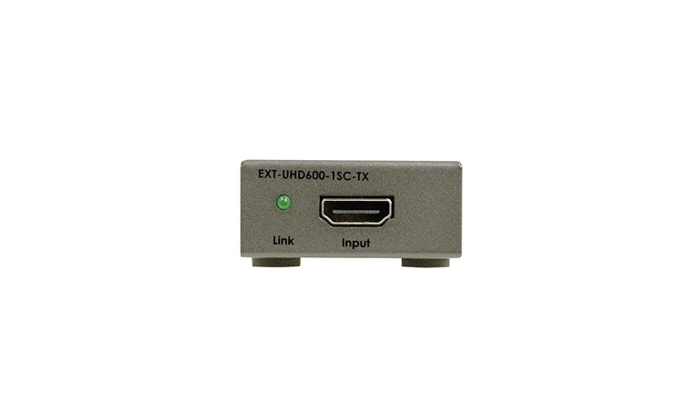 Комплект устройств для передачи сигналов HDMI 4096x2160/60 (4:4:4) с HDR, с HDCP 1.4, 2.2 и EDID, полоса пропускания 600 МГц, по многомодовому кабелю (SC), расстояние до 200 м (OM3 или лучше).