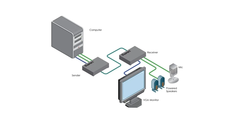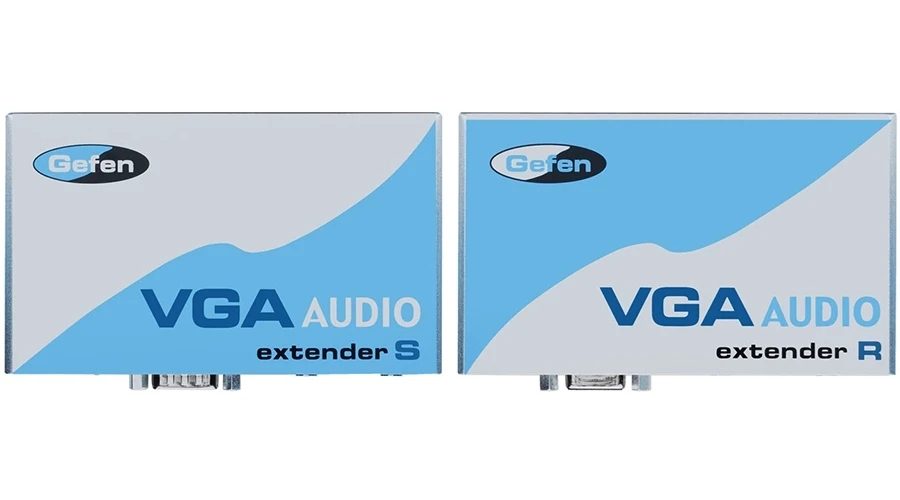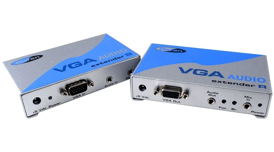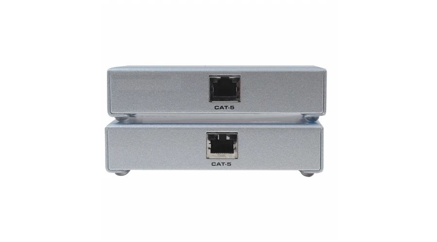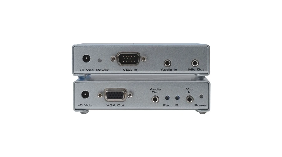 Комплект устройств для передачи сигналов VGA (D-sub-15) 1080p (1920х1200), стереоаудио (miniJack 3,5 мм) и одного возвратного канала аудио (miniJack 3,5 мм) по витой паре CAT5e, расстояние 45 м.