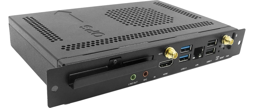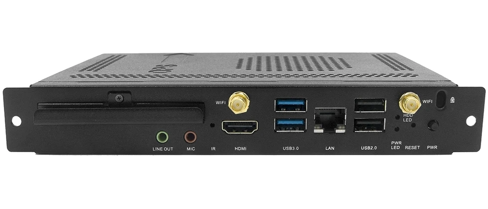 Компьютер OPS (Open Pluggable Specification): Intel i7-7500U 2.5 ГГц, 16 ГБ DDR RAM, 240 ГБ SSD, HDMI 4096x2304/24, DP 4096x2304/60, 1000BaseT, Wi-Fi/BT/3G, RS-232, USB 2.0, 3xUSB 3.0, ПО Windows 10, Avocor Note.
