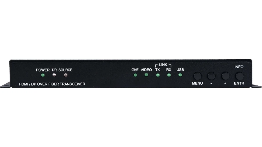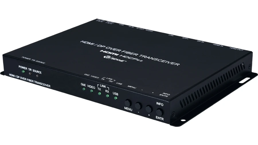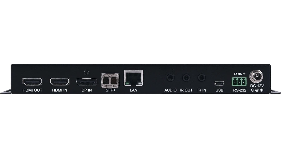 Конфигурируемый приемник / передатчик сигналов HDMI и DP 4096x2160p60 (4:4:4) c HDR, HDCP 1.4, 2.0, Ethernet, стереоаудио, USB, RS-232 и двунаправленного ИК по оптической линии с использованием модуля SFP+, технология IP (SDVoE), мониторный выход HDMI. При специальном ПО работает как матричный коммутатор, контроллер видеостены. Полоса пропускания 600 МГц.