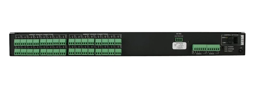 Контроллер на 32 входных сигналов от датчиков шума для системы GLOBALCOM, контроль по Ethernet (RJ45). Опциональный блок питания PS012 на 48 В. Монтаж в стойку, высота 1U.