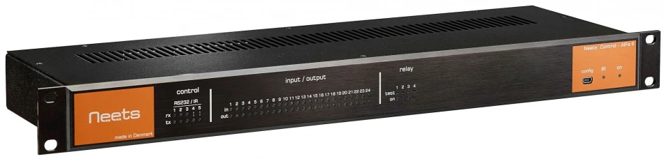 Контроллер рэковый. Черный цвет корпуса. Порты: 3 x RS-232(TX и RX) либо 4 х ИК; 2 x RS-232 (TX) либо 4 x ИК; 1 x LAN; 24 x I/O; 4 х Relay; 1 x NEB.