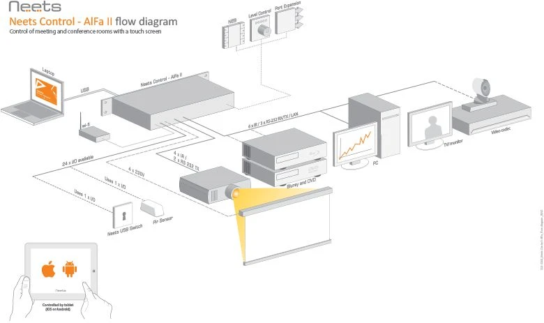 Контроллер управления Neets AlFa II обеспечивает комплексное и интуитивно понятное управление аудио-видео комплексами в аудиториях и больших конференц-залах. Данная система быстро устанавливается и настраивается, обеспечивая пользователям централизированное управление множеством функций всего лишь одним касанием.