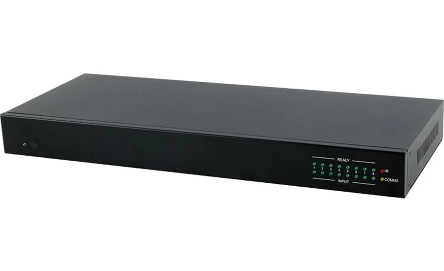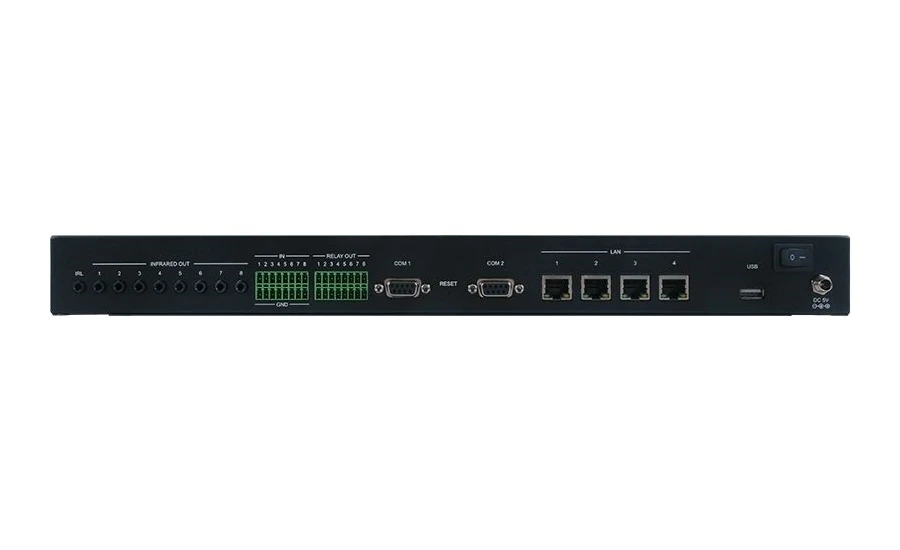 Контроллер системы управления, обучаемый ИК (miniJack 3,5 мм), триггерные входы (8х терм. блок), RS-232 (2хD-sub-9), 10/100BaseT (4хRJ45), релейные выходы (8х терм. блок), ИК (8х miniJack 3,5 мм), монтаж в стойку, управление по ИК, специальное ПО.
