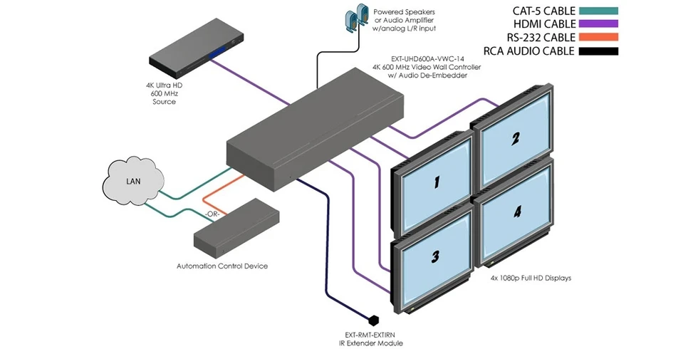 Контроллер видеостены от 4х1 до 1х4 сигналов HDMI 3840x2160/60 (4:4:4) c HDCP (при 4K только 2x2), выход – 4xHDMI 1080p (1920х1200/60) и деэмбеддер аудио, поворот, компенсация рамок, управление по ИК, RS-232 и IP, корпус для монтажа в стойку (1U), дополнительное ПО для настройки видеостены.