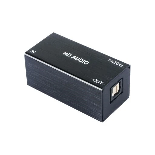 Конвертер двух каналов цифрового аудиосигнала из USB-B в S/PDIF (Toslink) для входа в усилитель мощности с частотой дискретизации до 192 кГц / 24 бит.