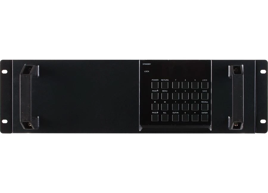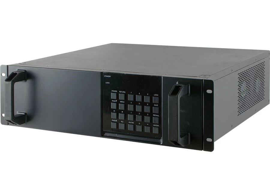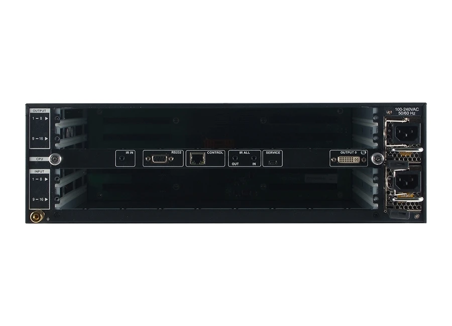 Корпус модульного матричного коммутатора 16x16, максимальная вместимость: 2 платы на вход, 2 платы на выход.