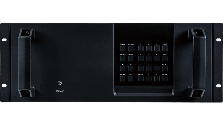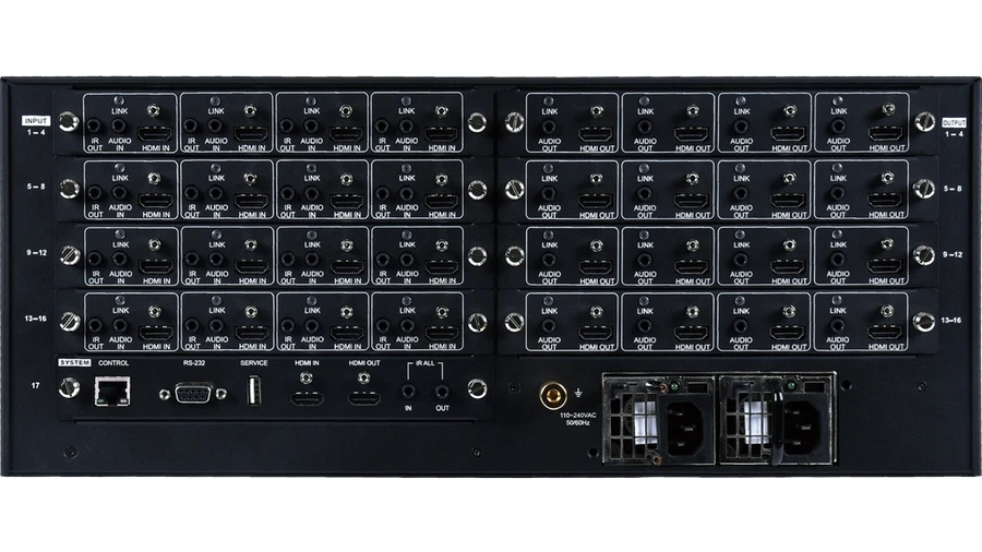 Корпус модульного матричного коммутатора 16x16 с разрешением до 4K/24 HDR (4:4:4), 4K/60 (4:2:0) и расширенным EDID, максимальная вместимость: 4 платы на вход, 4 платы на выход, полоса пропускания 600 МГц.