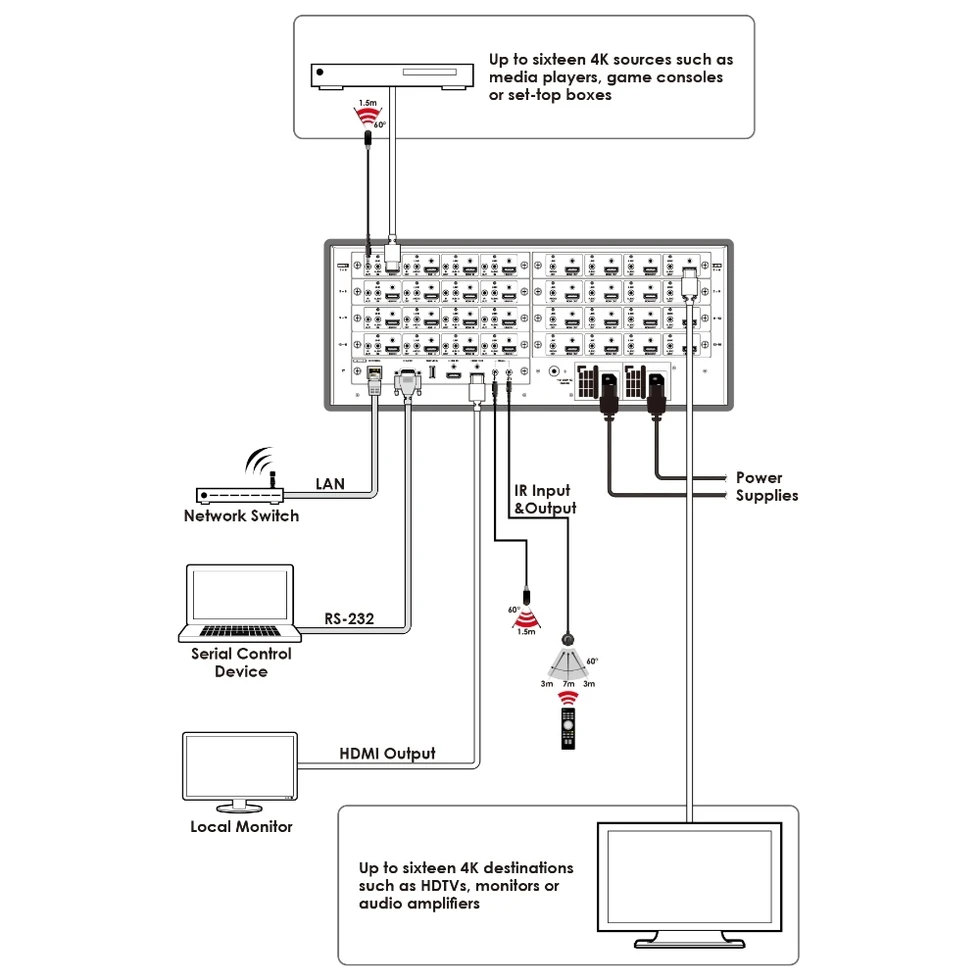 Корпус модульного матричного коммутатора 16x16 с разрешением до 4K/24 HDR (4:4:4), 4K/60 (4:2:0) и расширенным EDID, максимальная вместимость: 4 платы на вход, 4 платы на выход, полоса пропускания 600 МГц. Управление по IP (Telnet и Web - интерфейс), RS-232 и ИК.