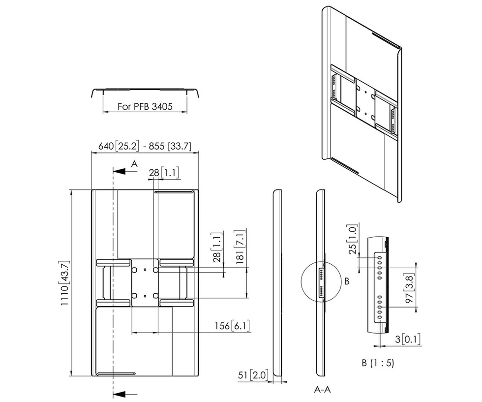 Кожух для задней стенки дисплея диагональю 50–55''. Крепится только при монтаже одиночного дисплея. Портретная ориентация. Используется только при монтаже одиночного дисплея на крепежные планки PFB 3402, PFB 3405 модульной крепежной системы Connect-it. Цвет черный.