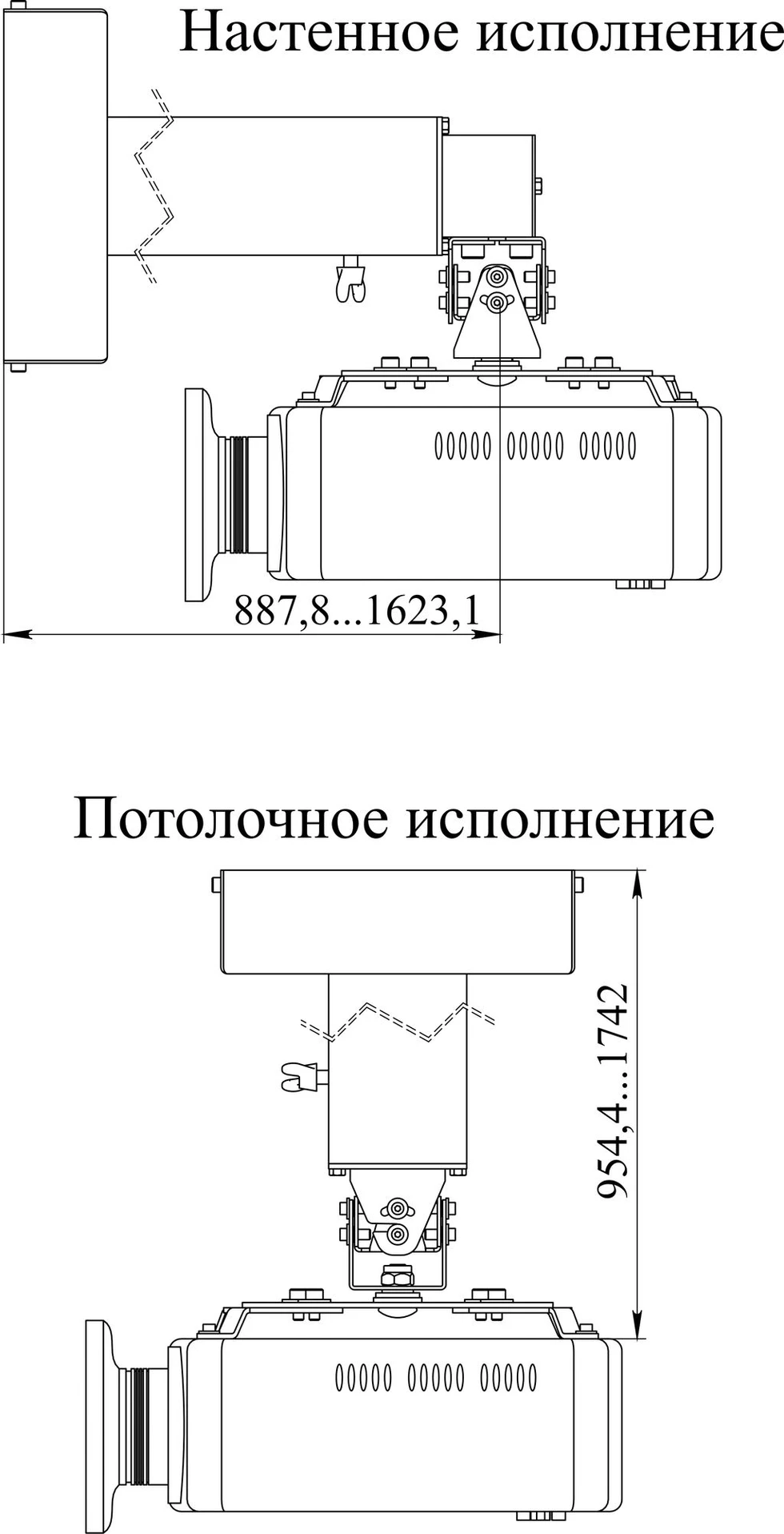 Диапазон регулировок по расстоянию: от потолка при вертикальном креплении - 955-1740 мм / от стены при горизонтальном креплении - 890-1620 мм.