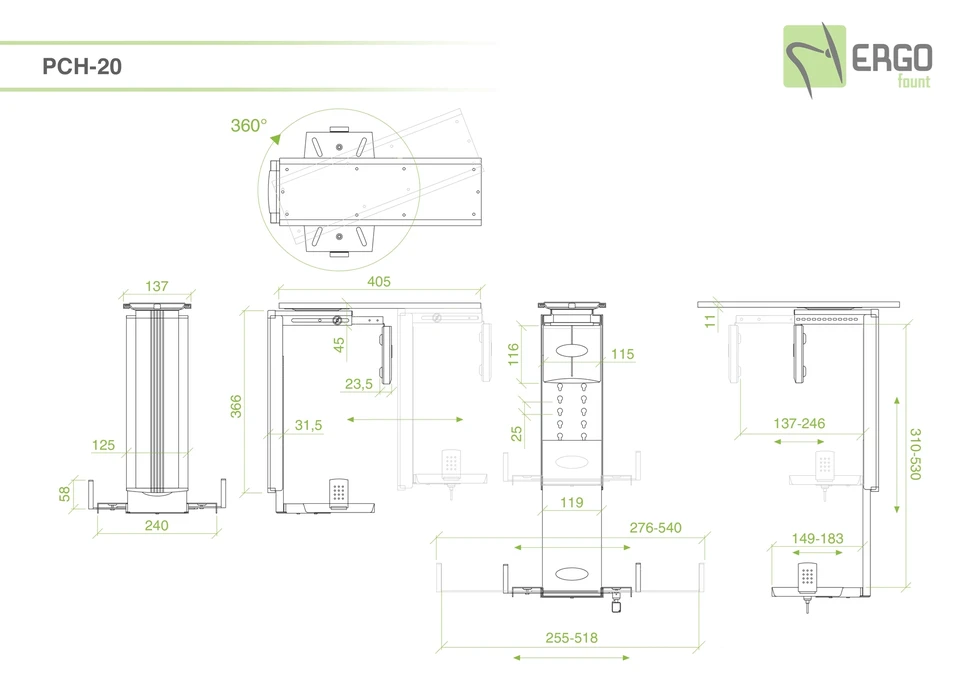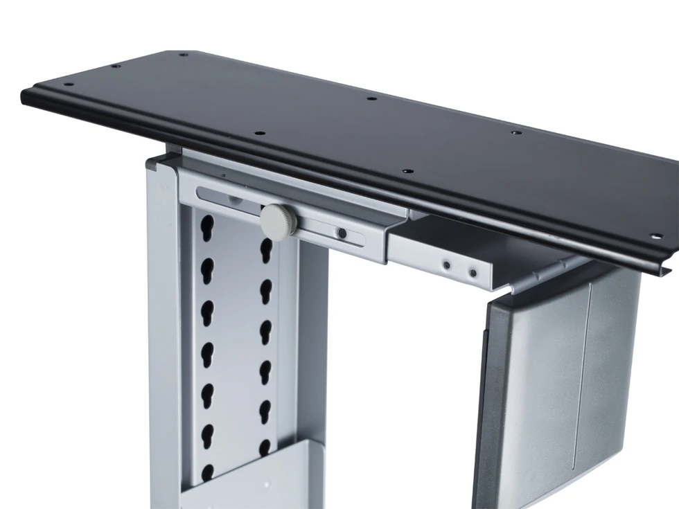 Крепление-подставка для системного блока под стол с возможностью перемещения и защитой от вибрации. Доступна функция вращения на 360 градусов, регулировка по длине, глубине и высоте (13,5-24 см х 25-50 см х 30-52,5 см). Максимальная нагрузка 25 кг.