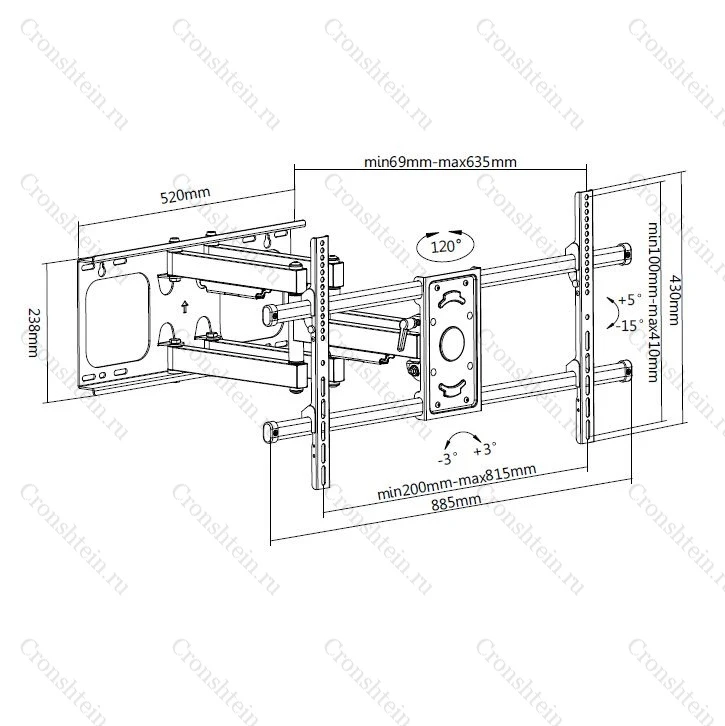Наклонно-поворотный кронштейн для ТВ Digis DSM-P4986.арт 7219 предназначен для телевизоров с диагональю от 40 до 90 дюймов. Усиленная двуручная конструкция имеет широкий диапазон регулировки положения и перемещения телевизора, исключительную плавность движений, а два параллельных колена исключают перекос экрана в любом положении. Сохраняя все преимущества и функциональность шарнирных кронштейнов, кронштейн Digis DSM-P4986 отличается особой прочностью и надёжностью, исключительной маневренностью и новой быстрой системой сборки. Широкие возможности по повороту, наклону, перемещению в различных направлениях, а также изменение угла наклона экрана дают возможность устранить блики и обеспечить максимальный комфорт и удобство при просмотре с любой точки. Регулировка наклона осуществляется лёгким прикосновением.