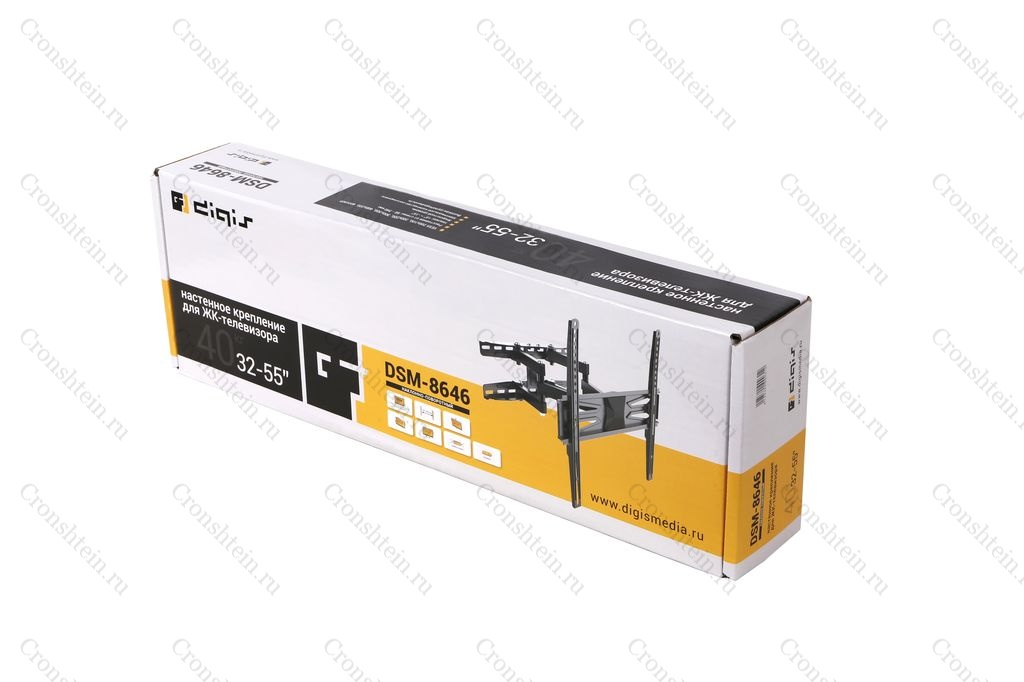 Наклонно-поворотный кронштейн для ТВ Digis DSM-8646.арт 7216 предназначен для телевизоров с диагональю от 32 до 55 дюймов. Усиленная двуручная конструкция имеет широкий диапазон регулировки положения и перемещения телевизора, исключительную плавность движений, а два параллельных колена исключают перекос экрана в любом положении. Сохраняя все преимущества и функциональность шарнирных кронштейнов, кронштейн Digis DSM-8646 отличается особой прочностью и надёжностью, исключительной маневренностью и новой быстрой системой сборки. Широкие возможности по повороту, наклону, перемещению в различных направлениях, а также изменение угла наклона экрана дают возможность устранить блики и обеспечить максимальный комфорт и удобство при просмотре с любой точки. Регулировка наклона осуществляется лёгким прикосновением.