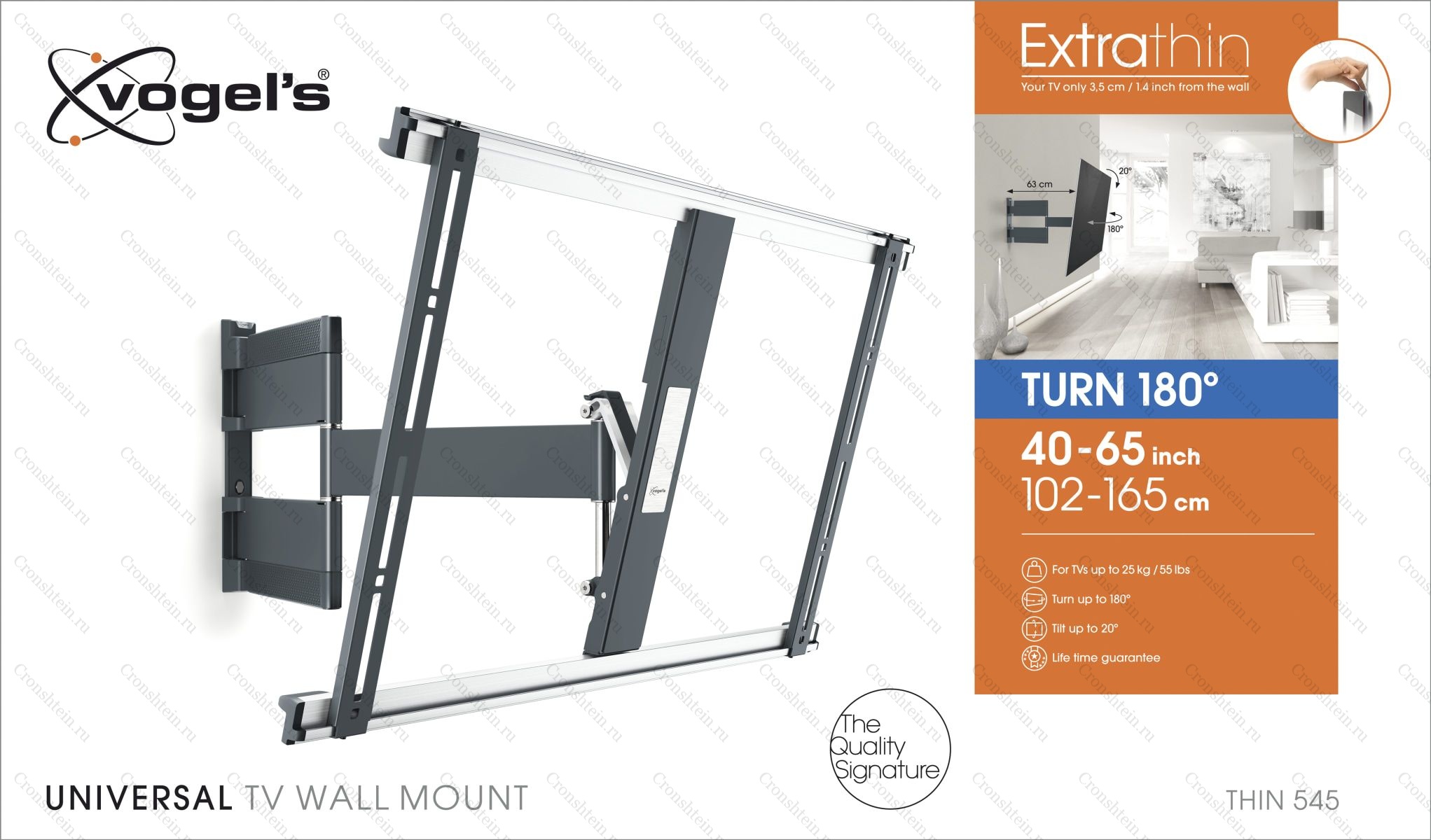 Наклонно-поворотный кронштейн для ТВ 40-65" Vogels THIN 545. арт 8177. Данное настенное крепление для телевизора способно удерживать вес до 25 кг. Почти любой телевизор с диагональю от 40 до 65 дюймов (102-165 см) можно плоско закрепить на стене с помощью THIN 545. Поворачивается на угол до 180° и наклоняется на угол до 20°. Расстояние от стены 35 мм.