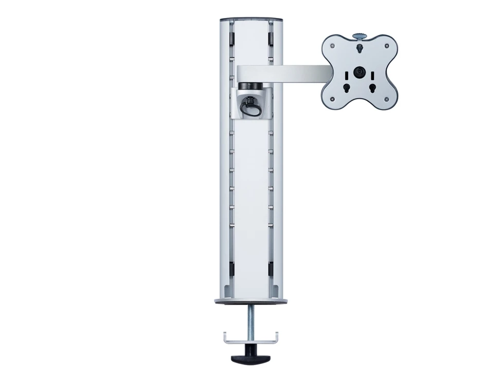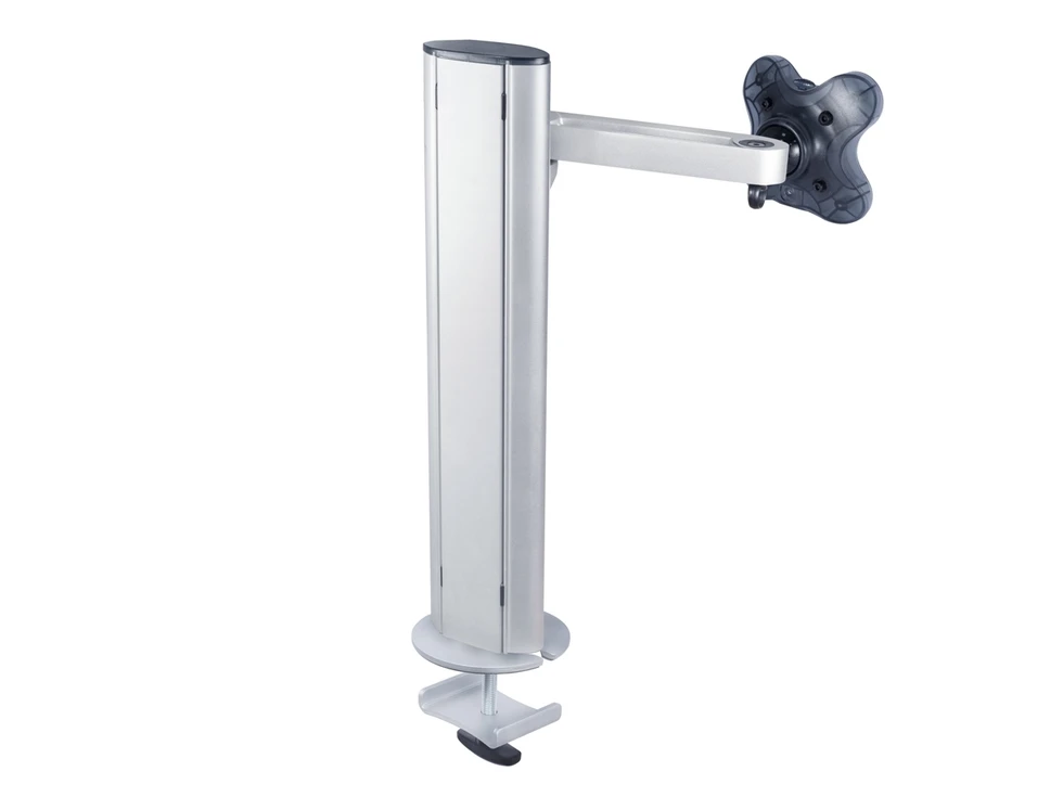 Крепление для одного монитора до 12 кг. Фиксируется к столу с помощью упора с винтом (требуется отверстие под него), имеет одинарный кронштейн. Вращение монитора на 360 градусов, наклон 30 градусов в обе стороны. VESA 75х75, 100х100, кабель-канал. Регулировка высоты на 24 см.