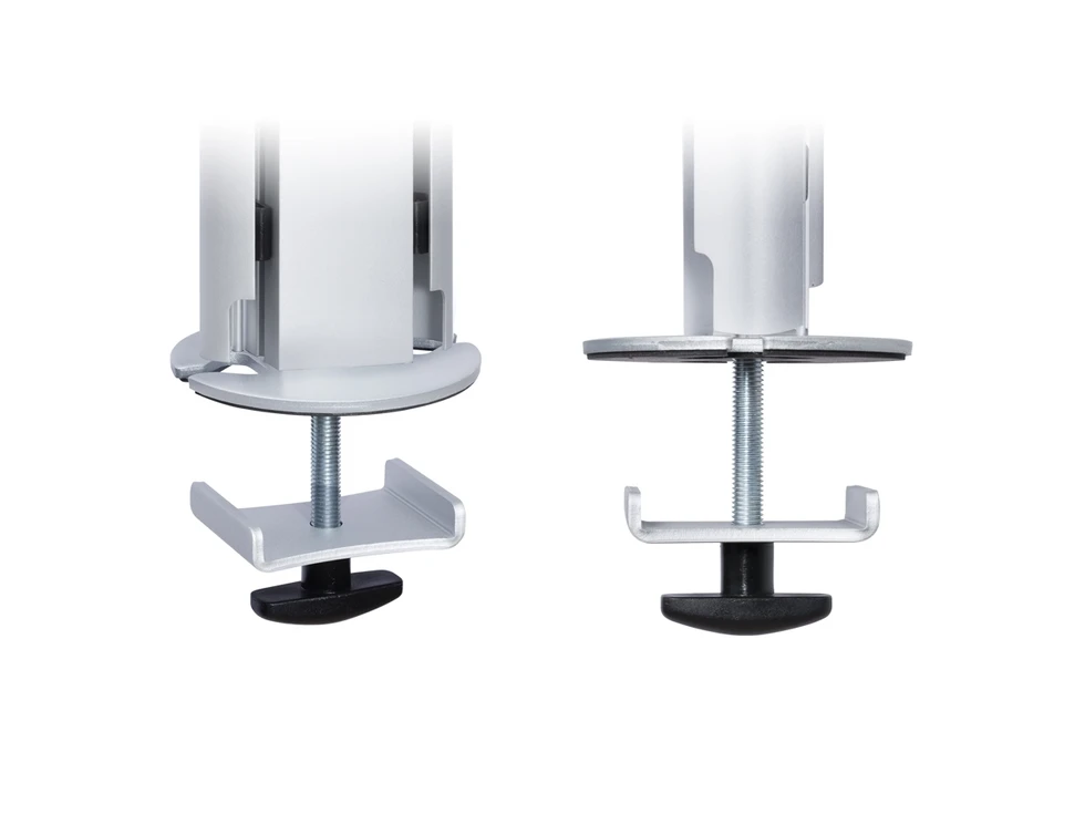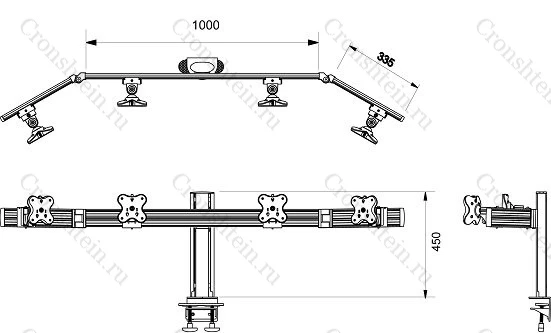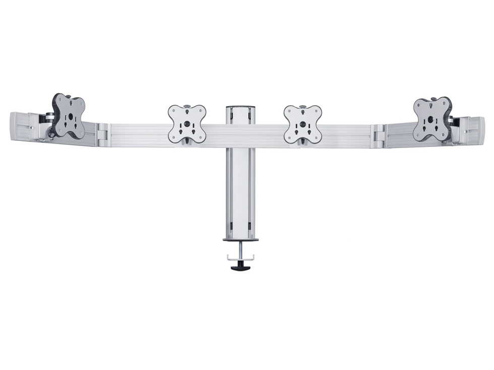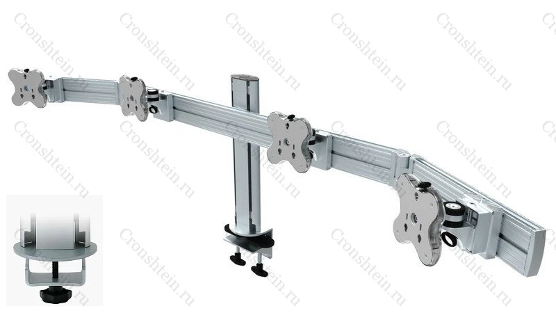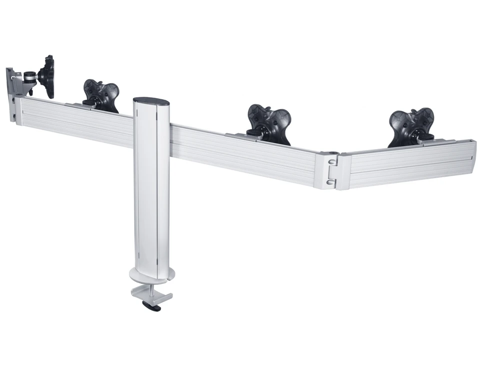 Настольное изогнутое крепление для трех мониторов до 24 дюймов в ряд. Доступна регулировка высоты в пределах 45 см, вращение на 360 и наклон на 30 градусов. VESA 75х75, 100х100. Используется крепление типа втулка. Максимальная нагрузка 48 кг.