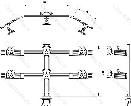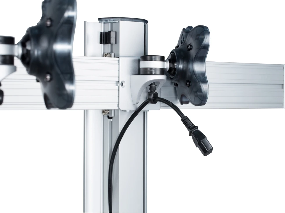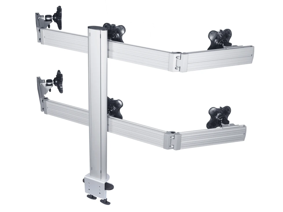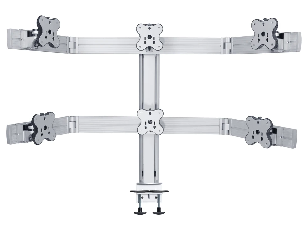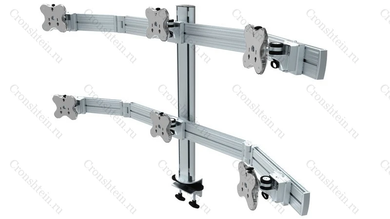 Настольное изогнутое крепление для шести мониторов до 24 дюймов в два ряда. Доступна регулировка высоты в пределах 80 см, вращение на 360 и наклон на 30 градусов. VESA 75х75, 100х100. Используется крепление типа струбцина, не требующее сверления отверстий. Максимальная нагрузка 48 кг.