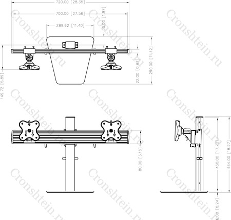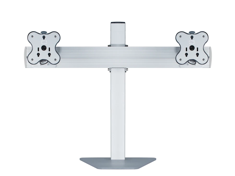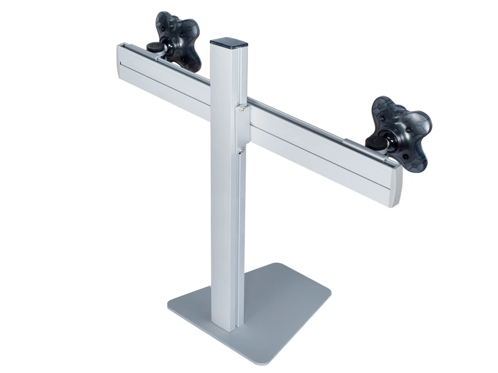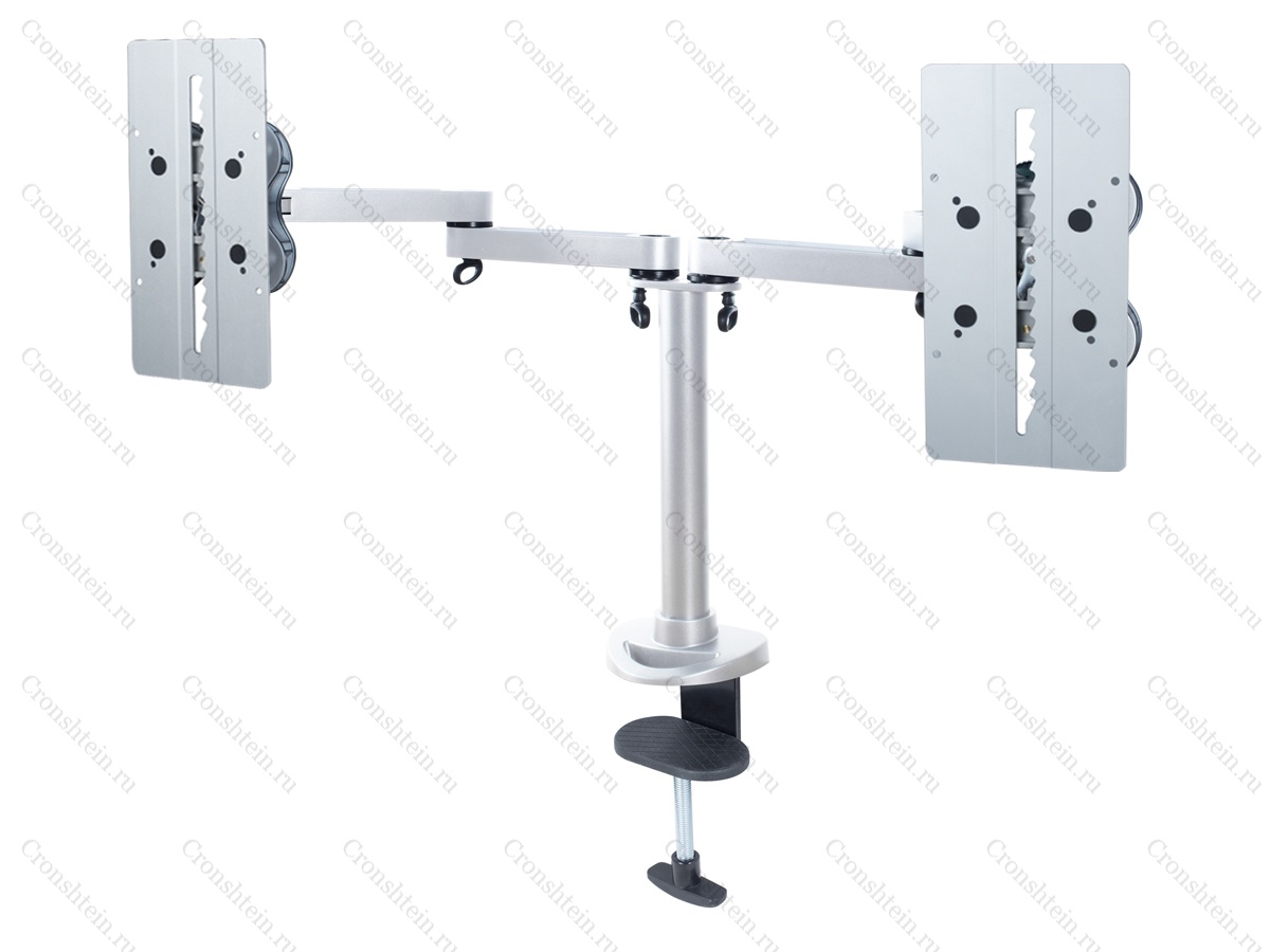 Настольное крепление для двух мониторов до 24 дюймов в ряд на стандартной стойке. Доступна регулировка высоты в пределах 45 см, вращение на 360 и наклон на 30 градусов. VESA 75x75, 100x100. Используется утяжеленное основание, не требующее сверления отверстий. Максимальная нагрузка 24 кг.