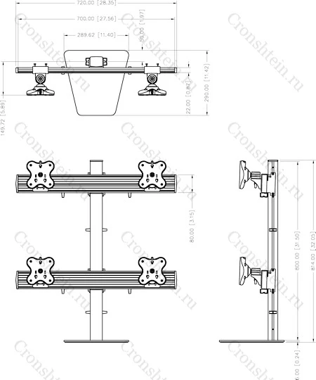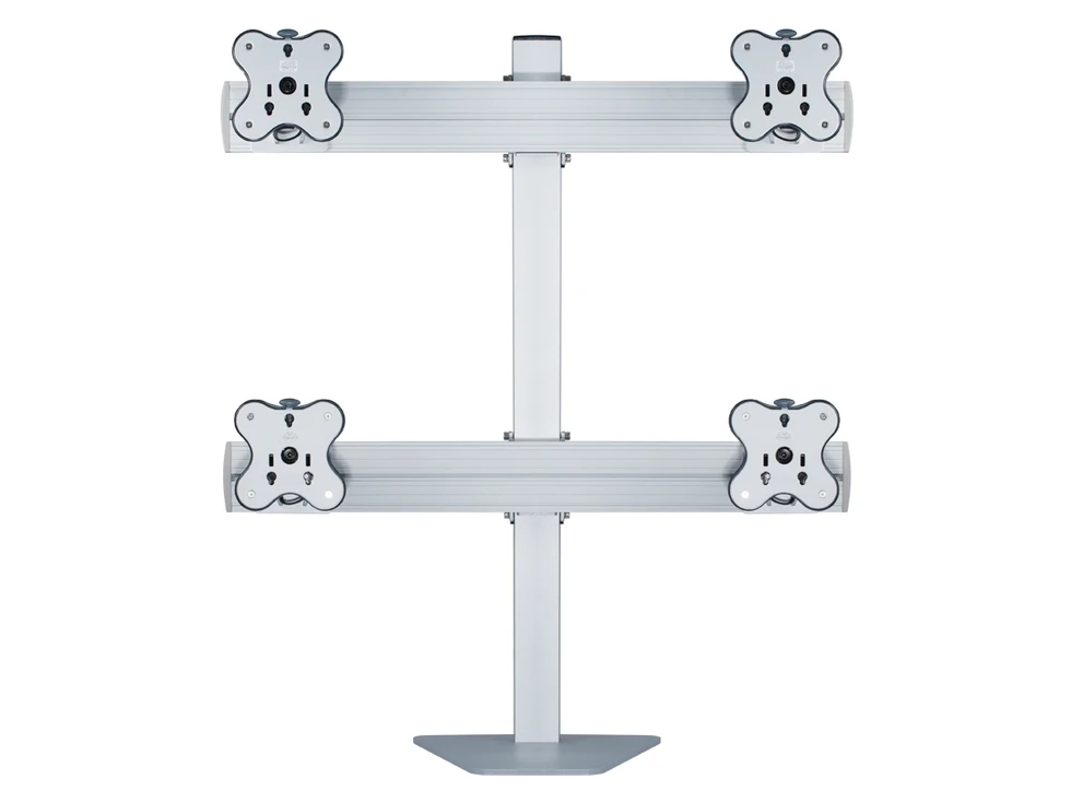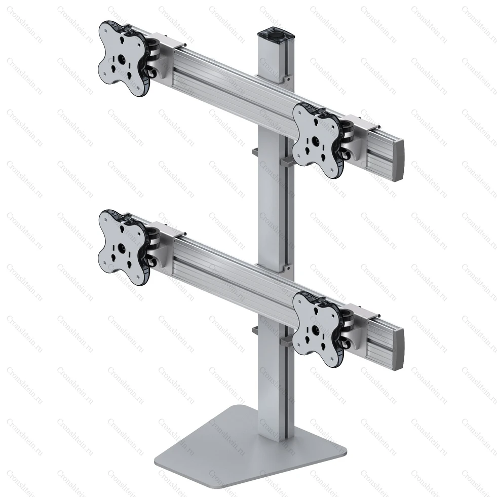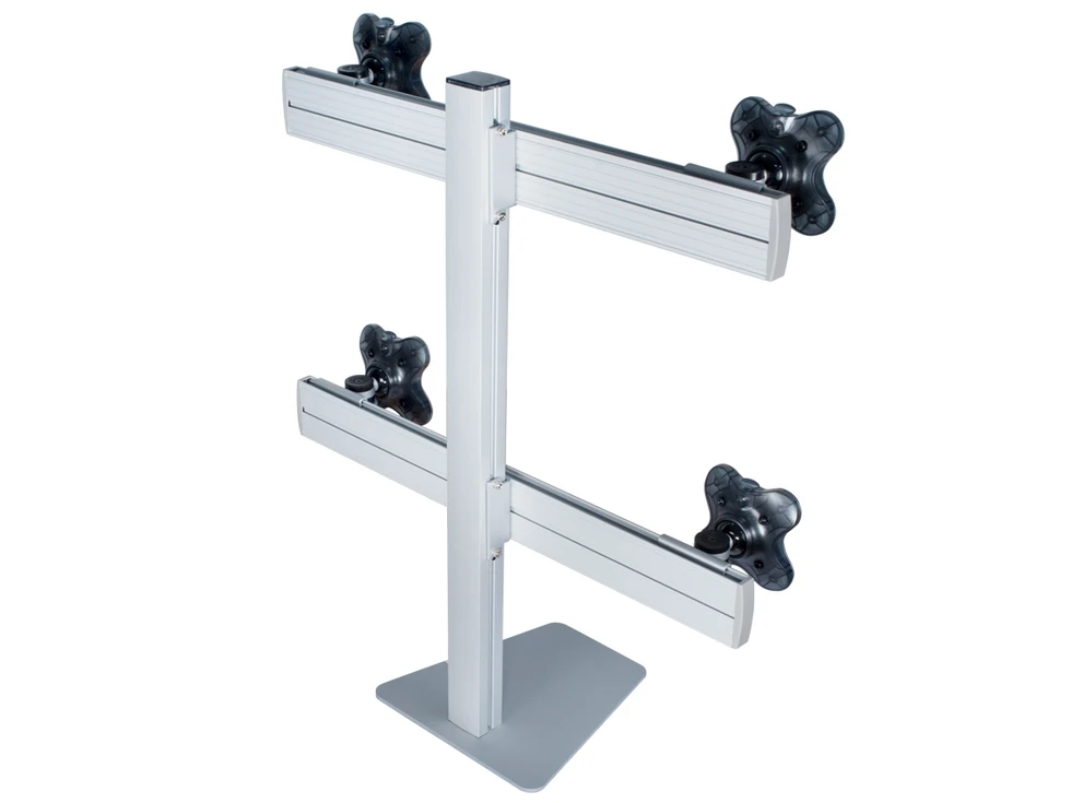 Настольное крепление для четырех мониторов до 24 дюймов в два ряда на высокой стойке. Доступна регулировка высоты в пределах 80 см, вращение на 360 и наклон на 30 градусов. Используется утяжеленное основание, не требующее сверления отверстий. VESA 75x75, 100x100. Максимальная нагрузка 48 кг. Используется утяжеленное основание, не требующее сверления отверстий. Максимальная нагрузка 24 кг.