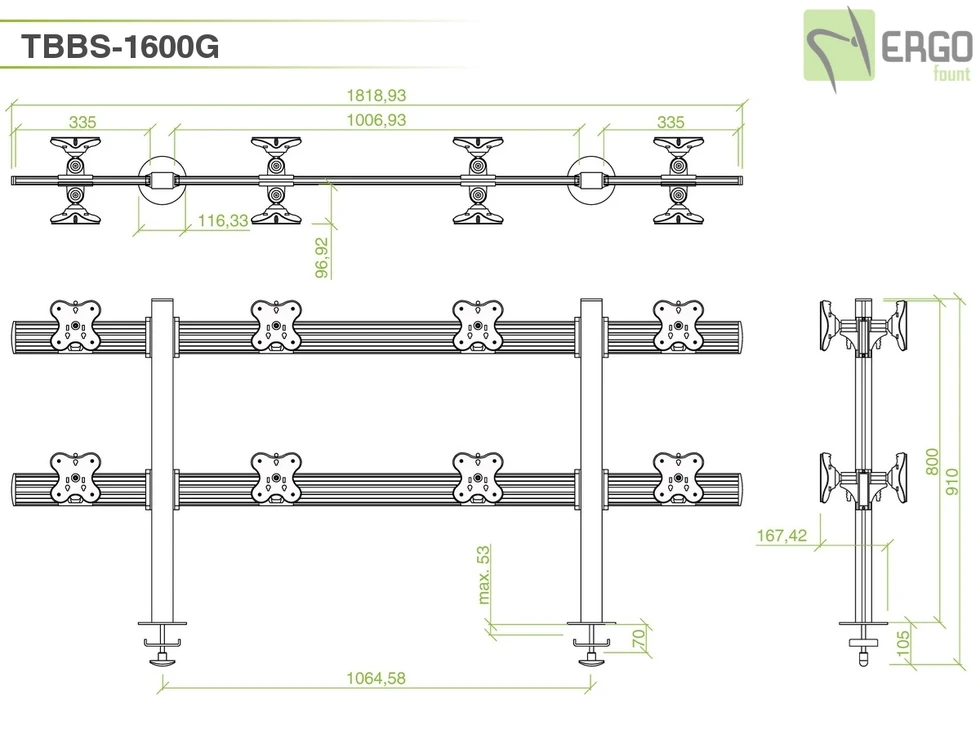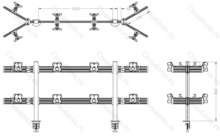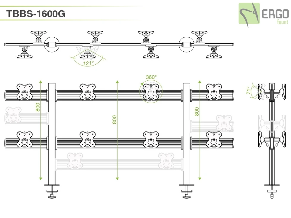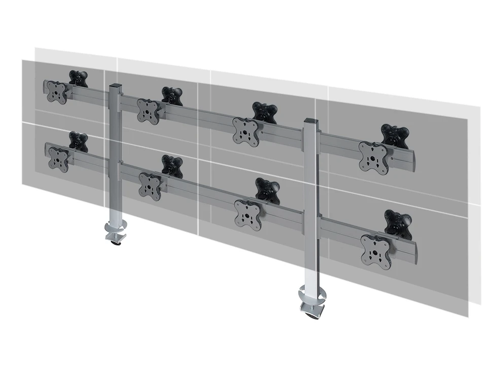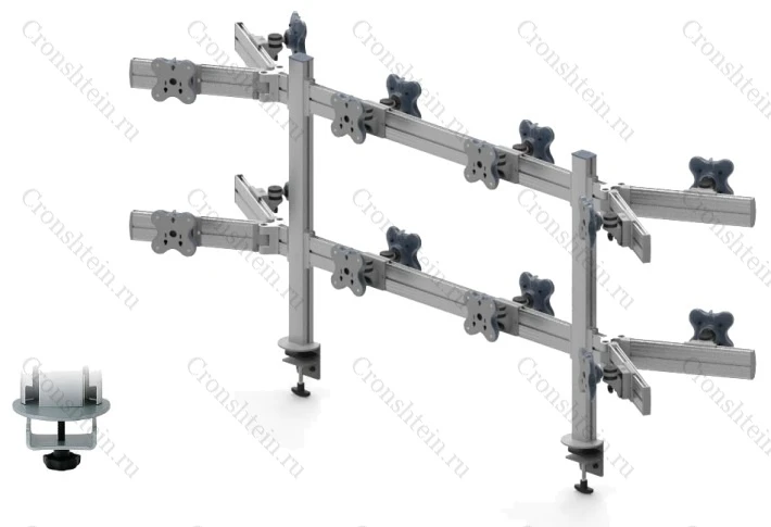 Настольное прямое крепление для шестнадцати мониторов до 24 дюймов спина-к-спине . Доступна регулировка по ширине и высоте (80 см), вращение на 360 и наклон на 30 градусов. VESA 75х75, 100х100. Используется крепление типа втулка. Максимальная нагрузка 192 кг