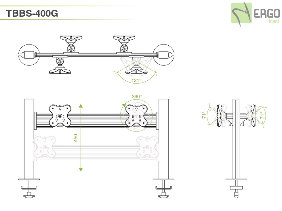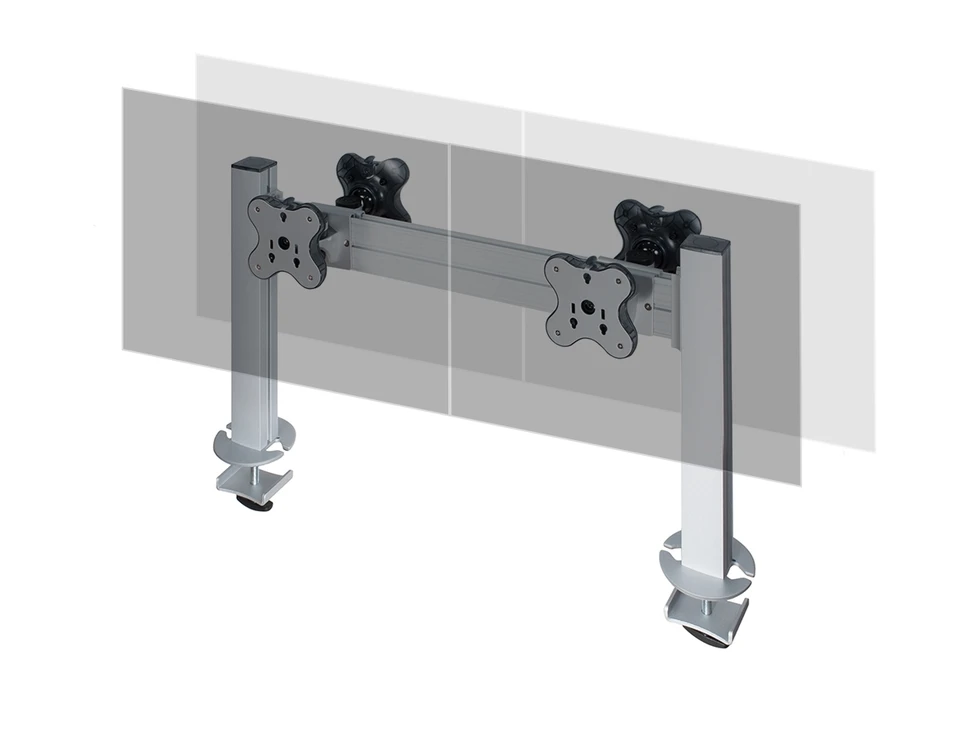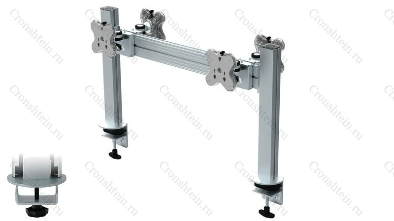 Настольное прямое крепление для четырех мониторов до 24 дюймов в положении спина-к-спине . Доступна регулировка по ширине и высоте (45 см), вращение на 360 и наклон на 30 градусов. VESA 75х75, 100х100. Используется крепление типа втулка. Максимальная нагрузка 48 кг.