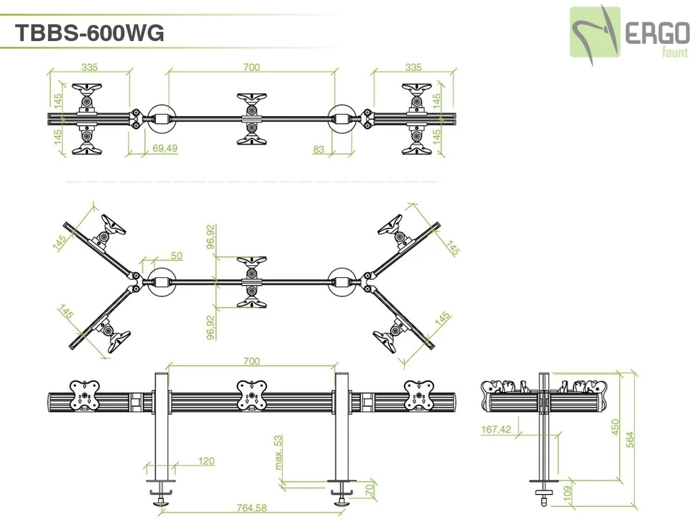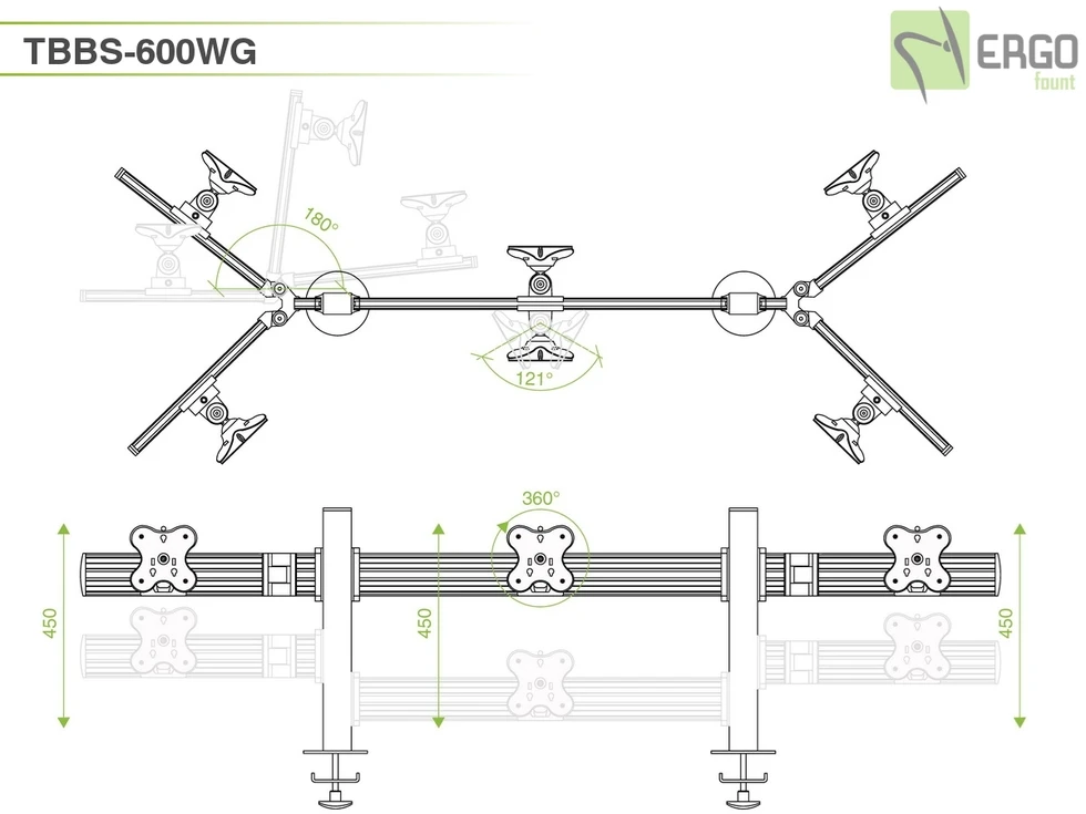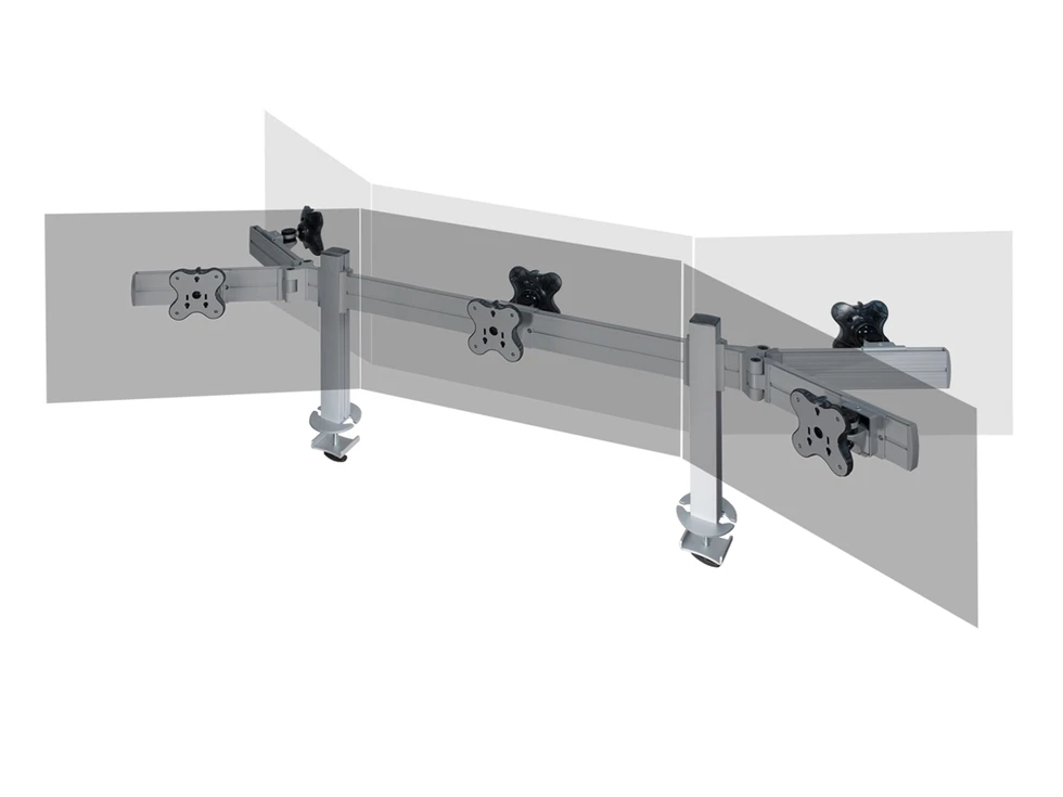 Настольное изогнутое крепление для шести мониторов до 24 дюймов в положении спина-к-спине . Доступна регулировка по ширине и высоте (45 см), вращение на 360 и наклон на 30 градусов. VESA 75х75, 100х100. Используется крепление типа втулка. Максимальная нагрузка 72 кг.