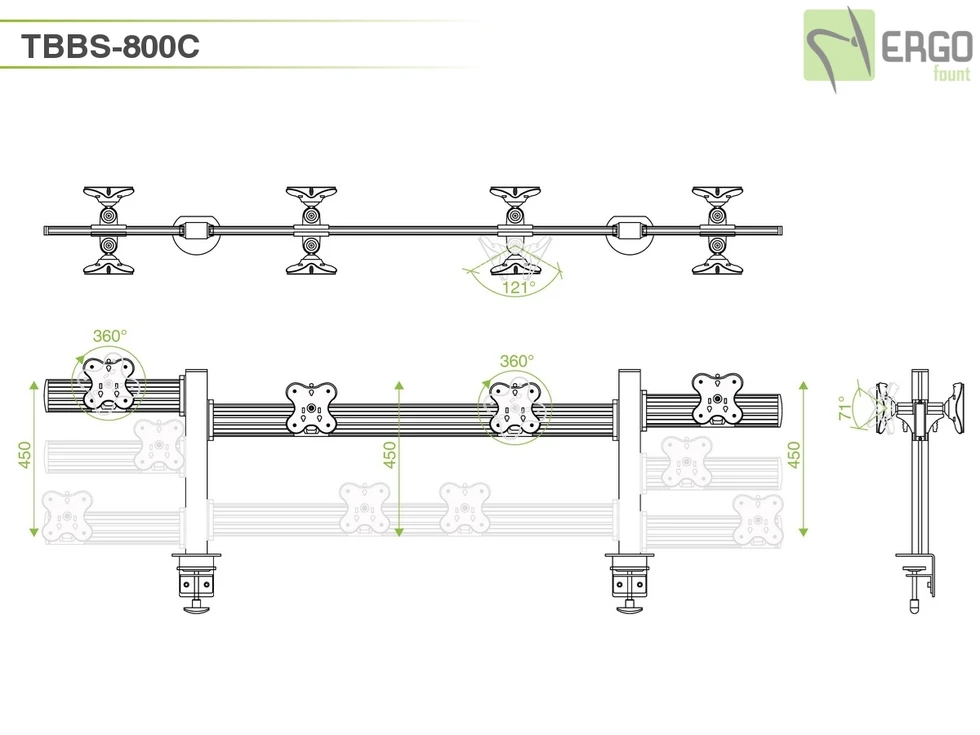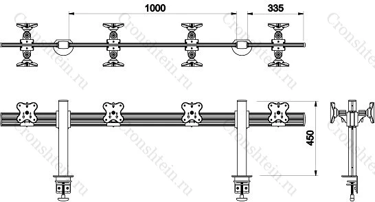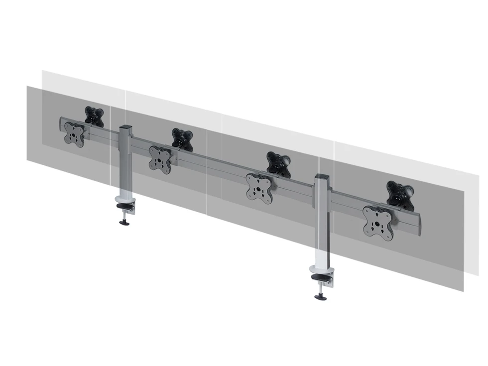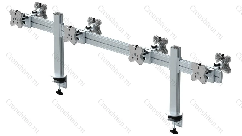 Настольное прямое крепление для восьми мониторов до 24 дюймов спина-к-спине . Доступна регулировка по ширине и высоте (45 см), вращение на 360 и наклон на 30 градусов. VESA 75х75, 100х100. Используется крепление типа струбцина, не требующее сверления отверстий. Максимальная нагрузка 96 кг.