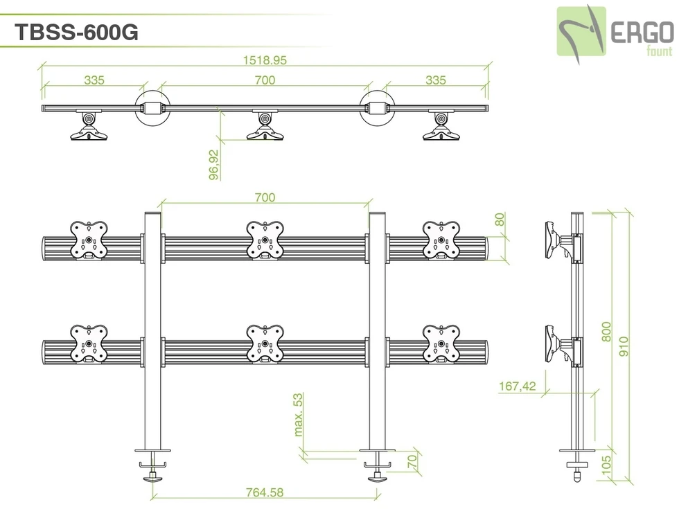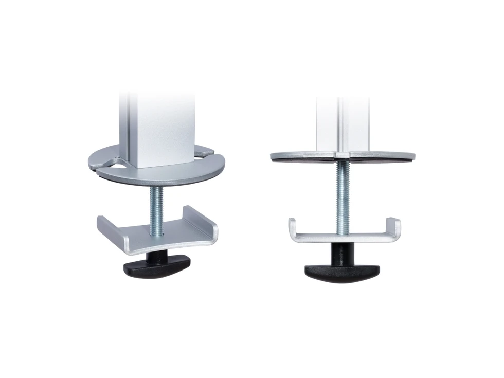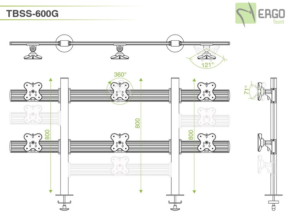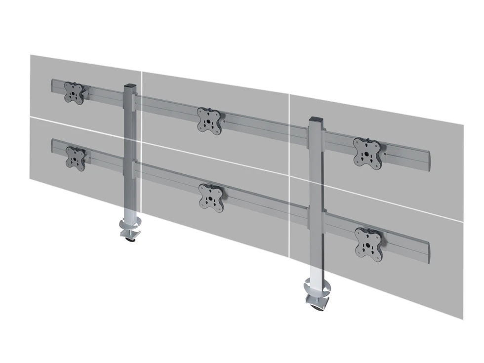 Настольное прямое крепление для шести мониторов до 24 дюймов в два ряда. Доступна регулировка высоты в пределах 80 см, вращение на 360 и наклон на 30 градусов. VESA 75х75, 100х100. Используется крепление типа втулка. Максимальная нагрузка 72 кг.