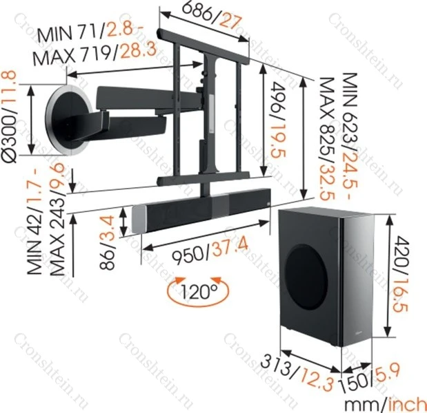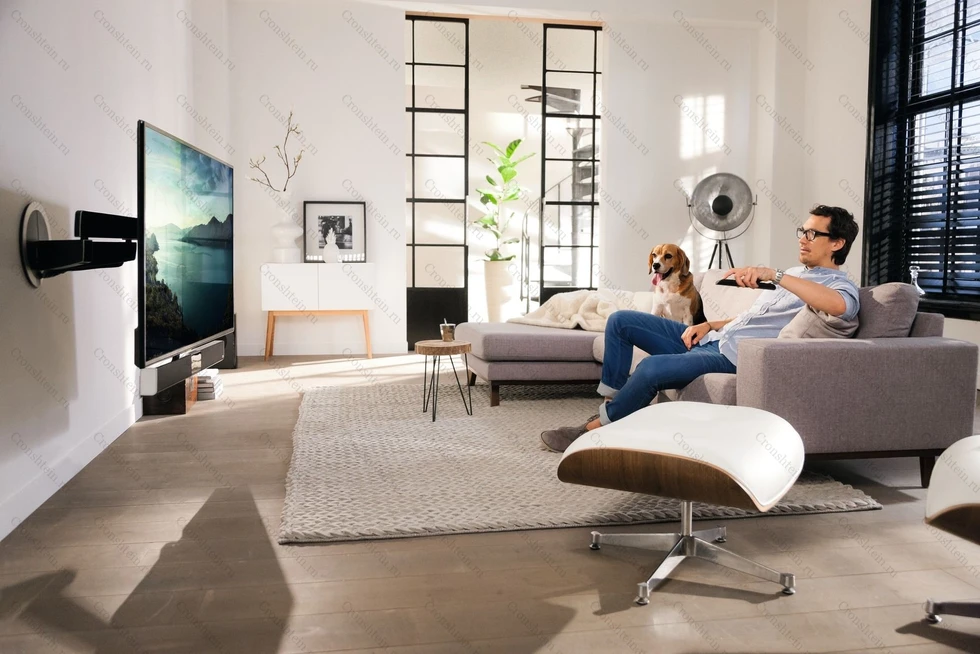 Телевизоры становятся тоньше и это происходит за счет снижения качества звука. Это, однако, не будет проблемой, благодаря Vogels MotionSoundMount NEXT 8375. Этот кронштейн сочетает в себе высококлассный поворотный настенный держатель и встроенную звуковую панель (в том числе беспроводной сабвуфер). Вы можете наслаждаться безупречным качеством изображения и звука с любого места в вашем помещении.
