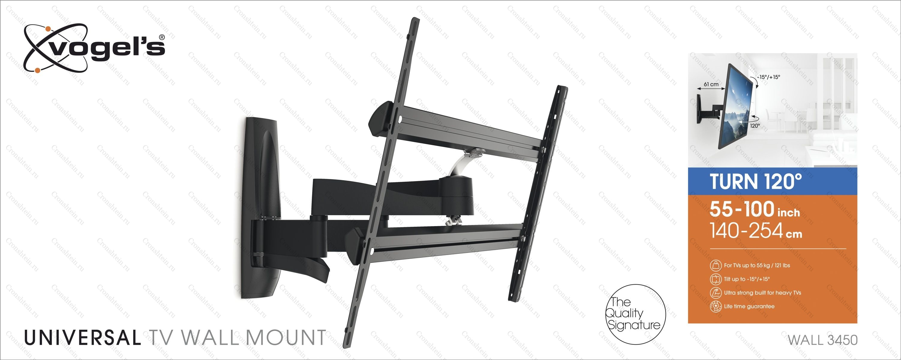 Наклонно-поворотный кронштейн для ТВ Vogels WALL 3450. арт 8069 разработан специально для очень больших и тяжелых телевизоров от 55 до 100 дюймов (140-254 см). Максимальный угол поворота составляет 120 °, а макс. угол наклона составляет 15 °.