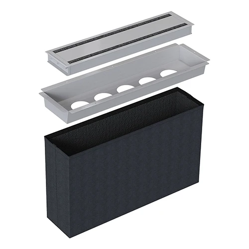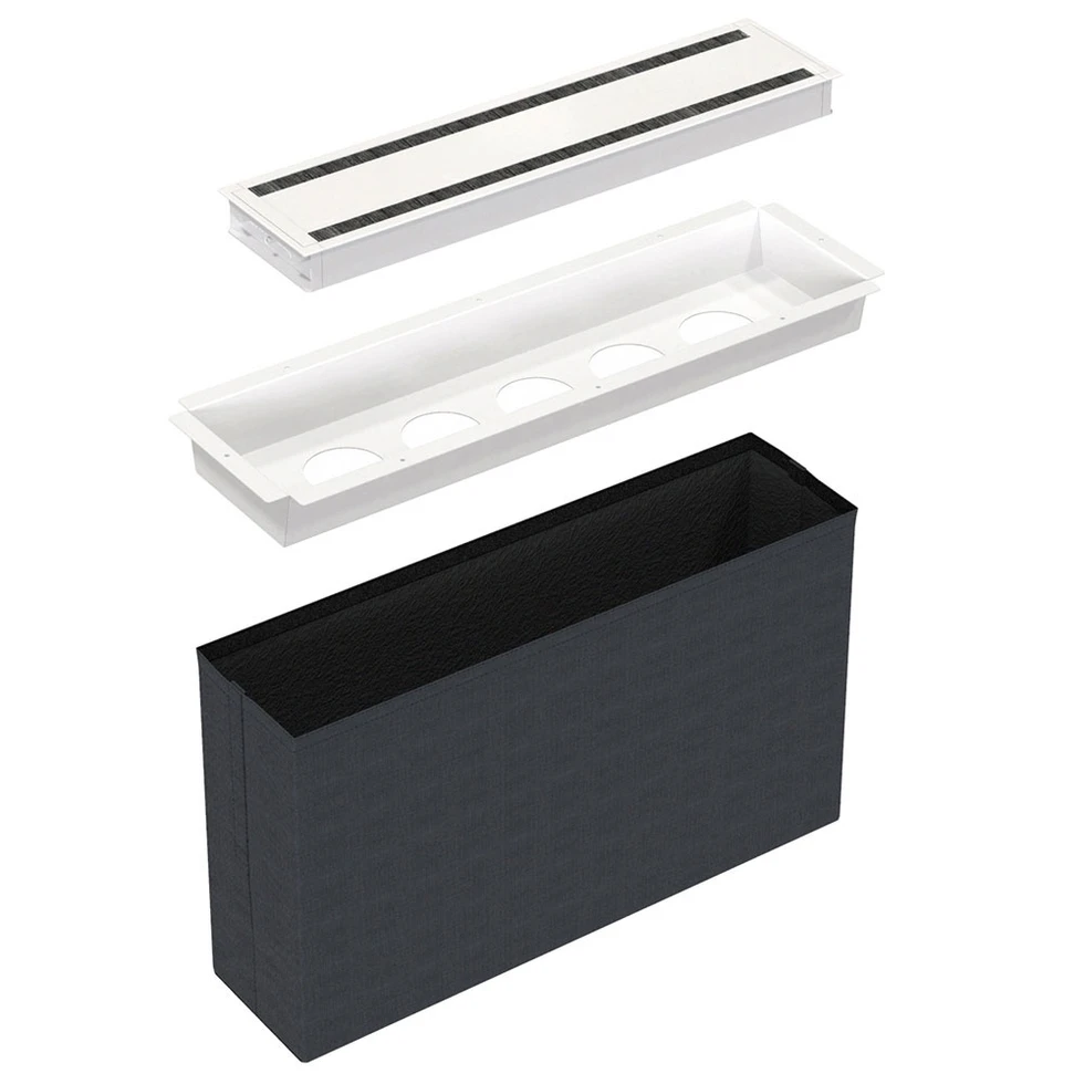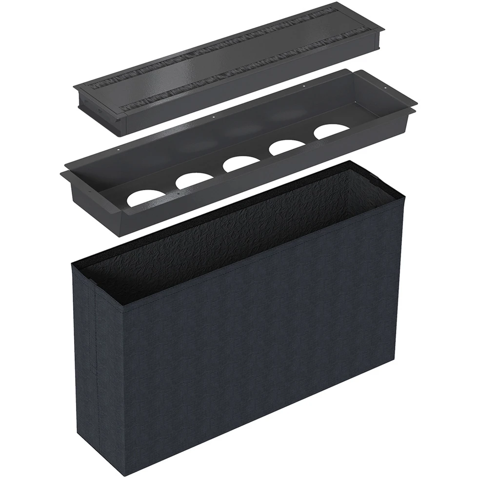 Лючок для установки 5 розеток Powerdot. Комплектация: крышка 935-TC60, короб для установки розеток 935-TP05, текстильный мешок для размещения кабелей 935-TP56. Размеры крышки (ШxГxВ): 610x148x44,2 мм. Монтажное отверстие: 600x140 мм. Цвет черный.