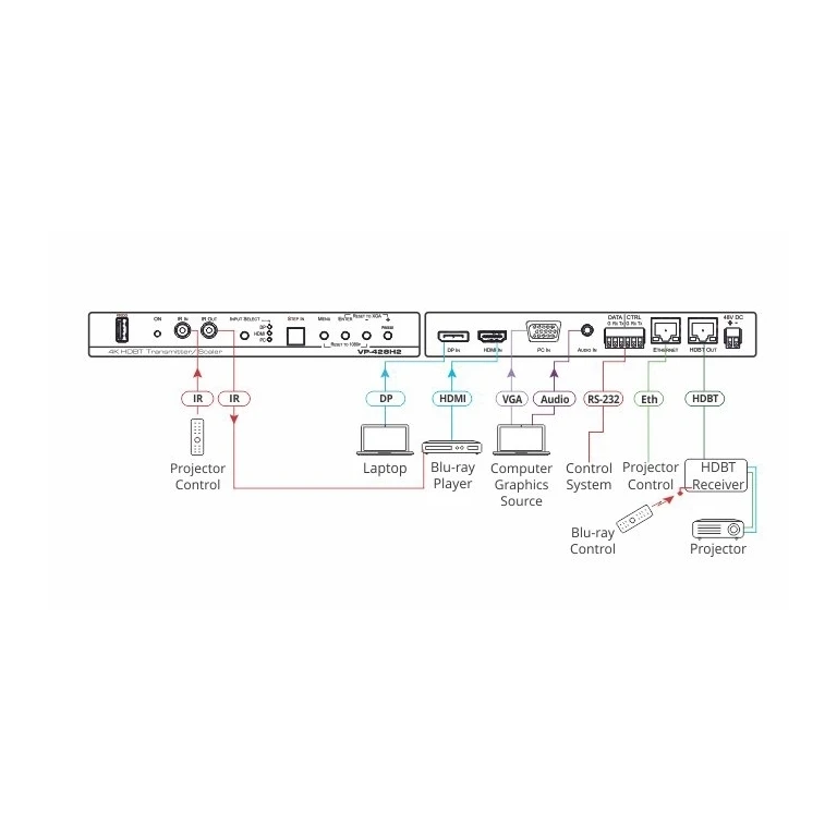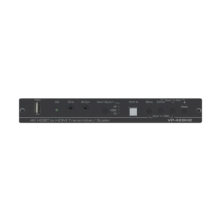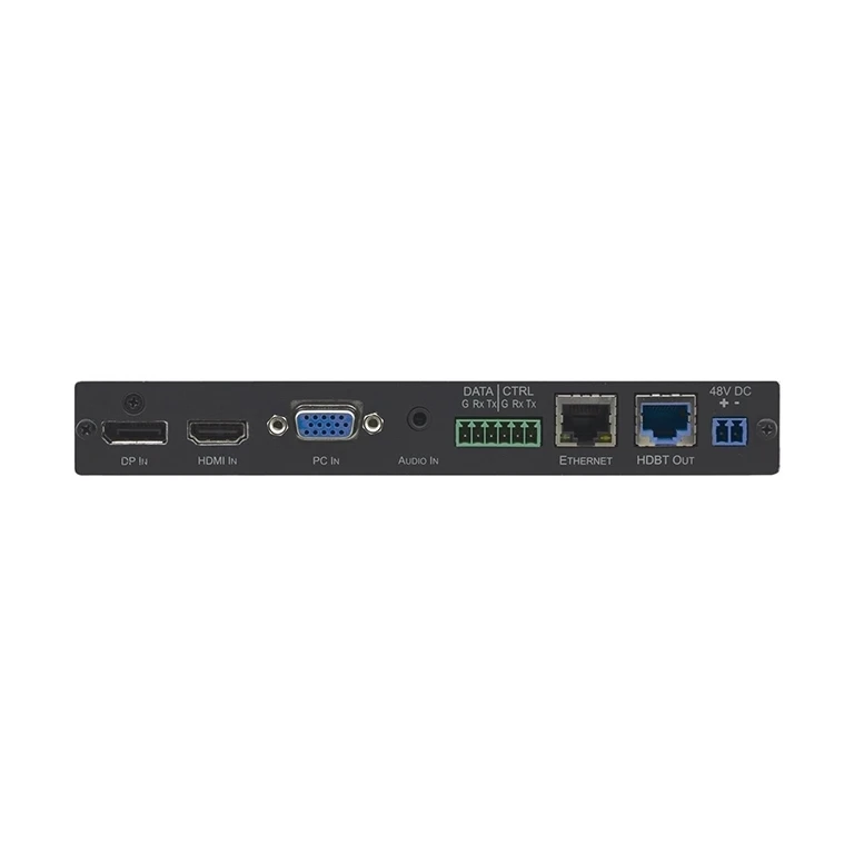 Масштабатор-автокоммутатор и передатчик сигналов HDMI 2.0 4K/60 (4:4:4) с HDCP 2.2, DisplayPort 4K/60 (4:4:4), VGA 1920х1200/60, Ethernet, стереоаудио (miniJack 3,5 мм), а также двунаправленных RS-232 (3-pin) и ИК (miniJack 3,5 мм) в витую пару HDBaseT 4K/60 (4:2:0) с PoE. Управление по ИК и RS-232.